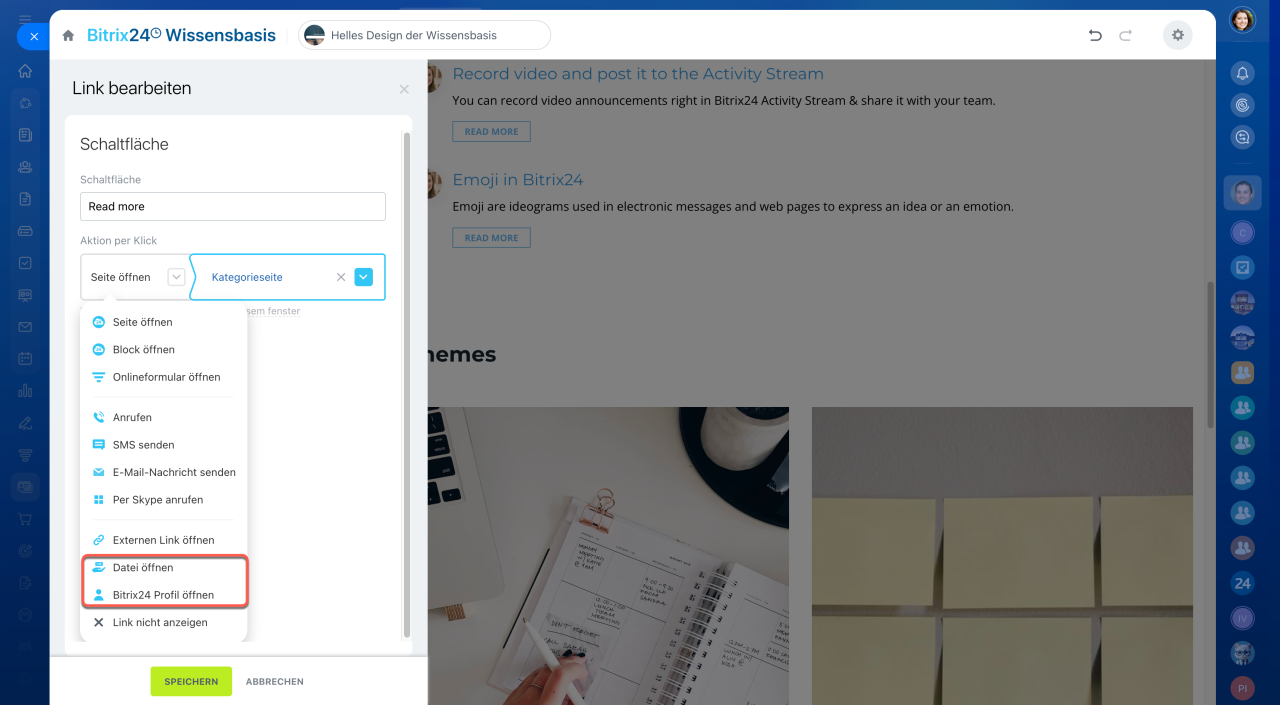 - In Onlineshops und Wissensdatenbanken stehen zusätzliche Aktionen zur Verfügung, wie das Öffnen von Produktkatalogen, Dateien aus Bitrix24 Drive oder Nutzerprofilen.
