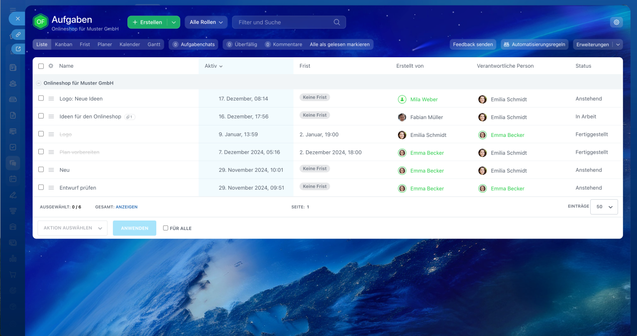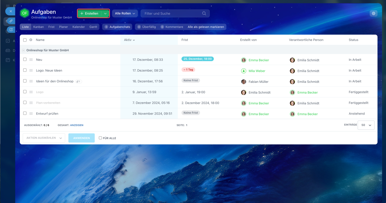 Kontrollieren Sie, wie die Collab-Teilnehmer an der Aufgabe arbeiten, und wählen Sie den gewünschten Arbeitsmodus mit Aufgaben aus: Liste, Kanban, Fristen, Planer oder Kalender. Der Kanban-Modus besteht beispielsweise aus Phasen, die Sie für die Bearbeitung von Aufgaben erstellen.