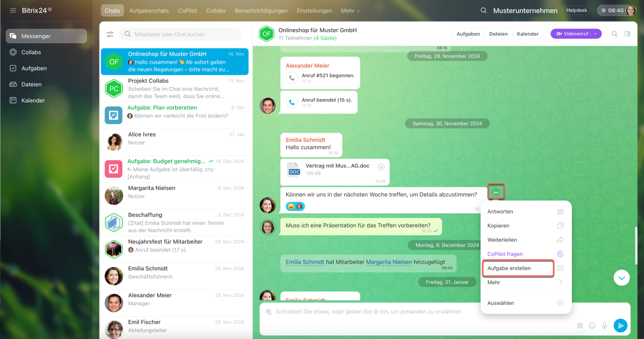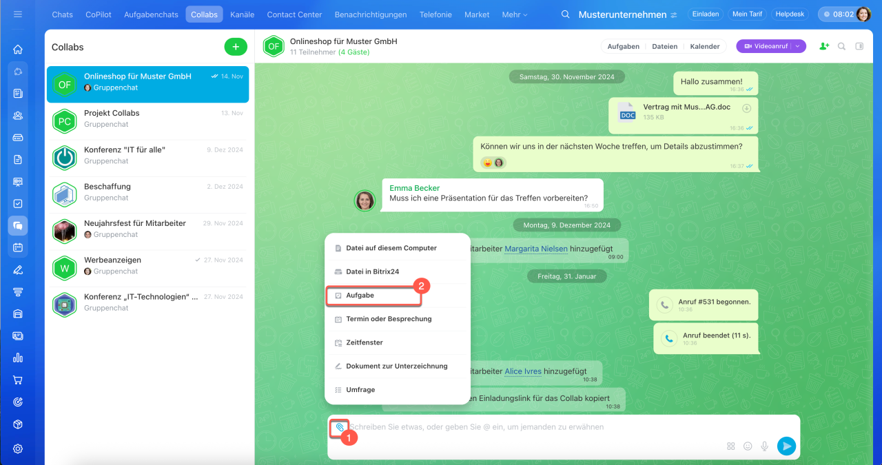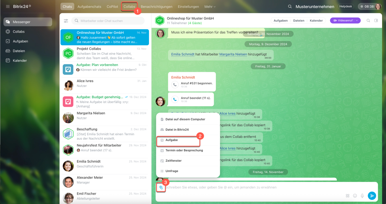 Im Collab-Chat. Öffnen Sie den Bereich Messenger. Klicken Sie auf Collabs und wählen Sie das gewünschte aus. Klicken Sie im Collab-Chat auf das Klammerbild und wählen Sie den Punkt Aufgabe aus.