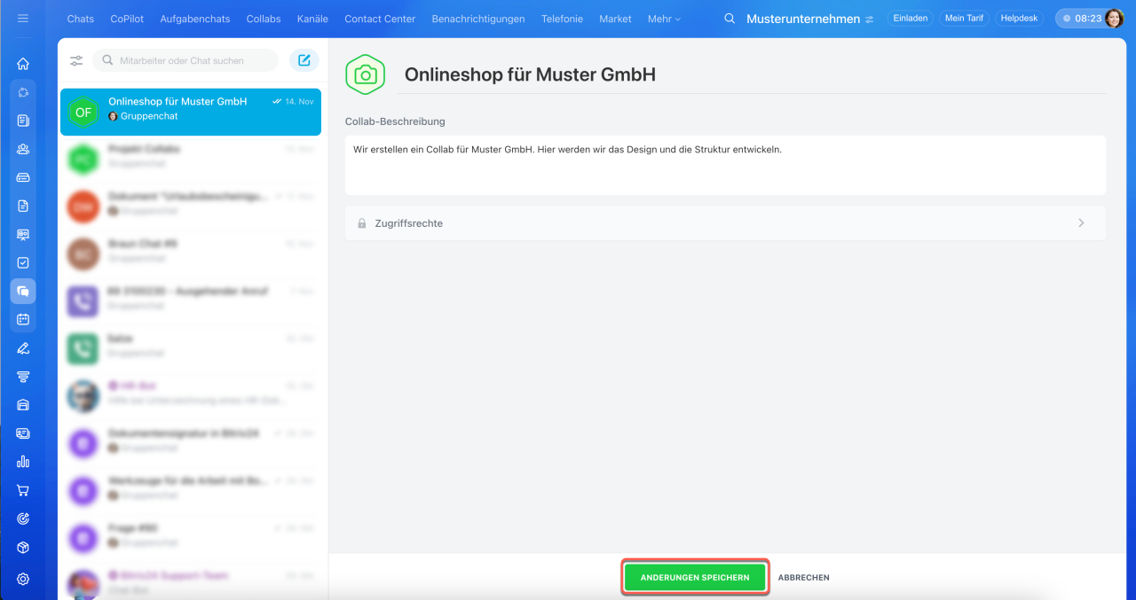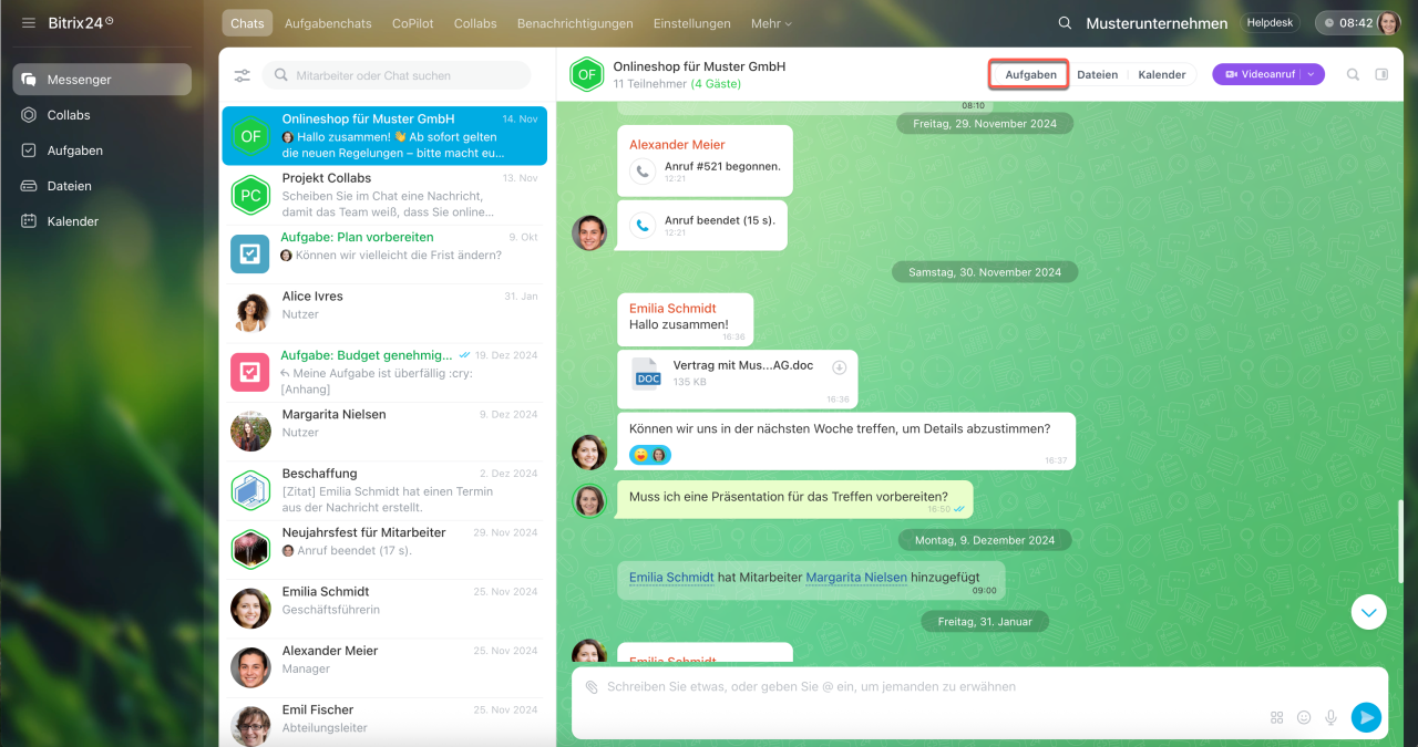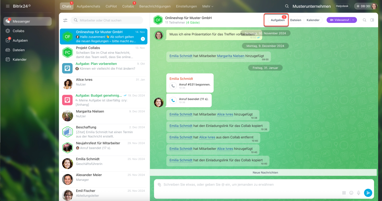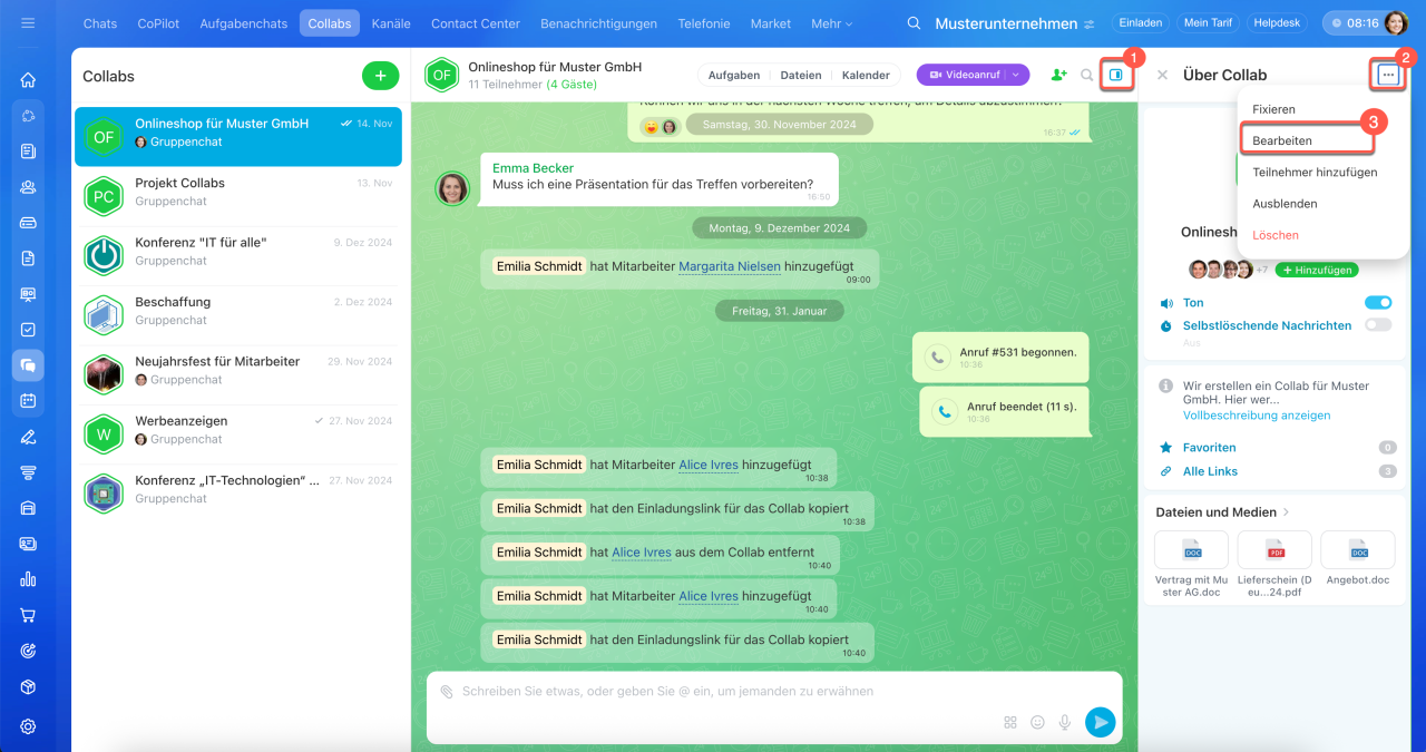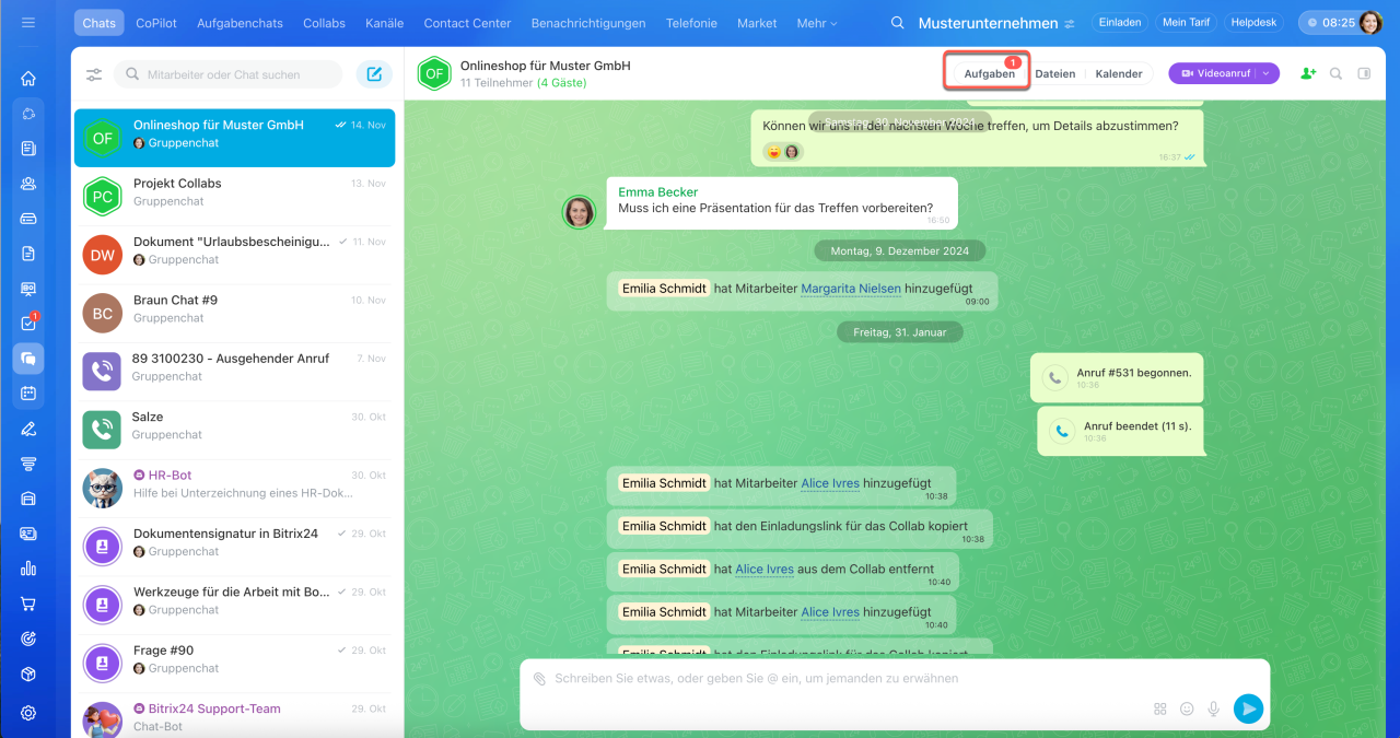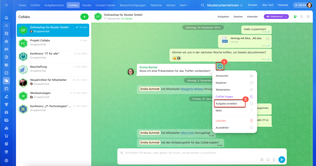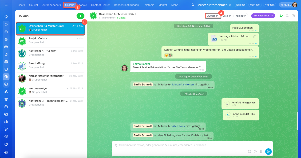 Collab ist ein Co-Working-Space für die Zusammenarbeit mit externen Teams und Kunden. Kommunizieren Sie im Chat, laden Sie Teilnehmer zu Veranstaltungen ein, arbeiten Sie mit Dateien und erstellen Sie Aufgaben. Aufgaben in Collabs helfen, schnell von Vereinbarungen zu konkreten Maßnahmen überzugehen. Die Teilnehmer sehen alle Aufgaben des Collabs, auch wenn sie nicht daran beteiligt sind.
