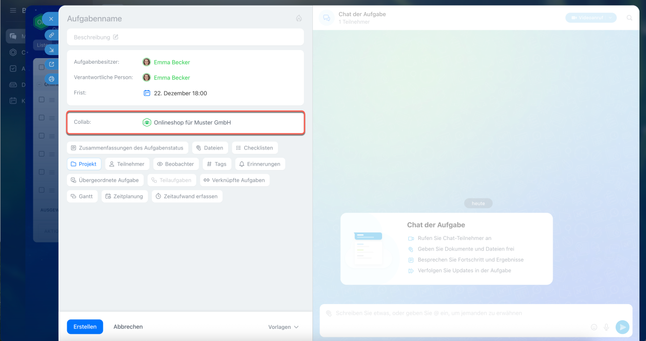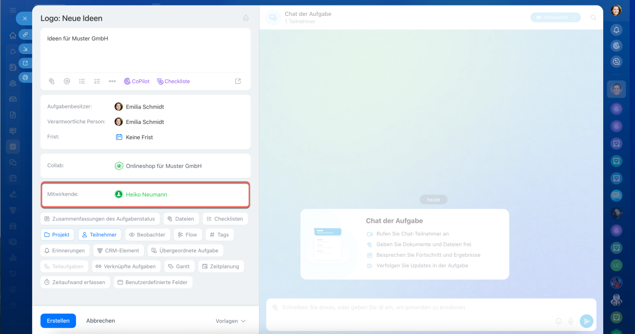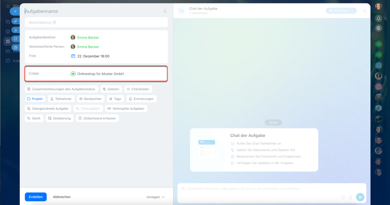 Geben Sie den Namen und die Beschreibung der Aufgabe ein und legen Sie zusätzliche Parameter fest: Frist, Checkliste, Tags und mehr. Der Ersteller wird automatisch als Verantwortlicher festgelegt, kann jedoch geändert werden. Externe Gäste des Collabs werden in der Liste grün dargestellt, sodass man sie schnell von Mitarbeitern unterscheiden kann.
