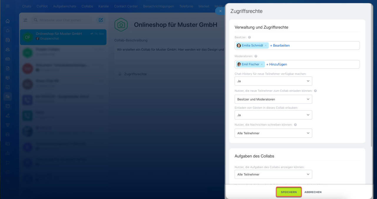 Bestimmen Sie, wer die Aufgaben anzeigen, bearbeiten und löschen darf, und klicken Sie auf Speichern. Danach klicken Sie auf Änderungen speichern in den Collab-Einstellungen.