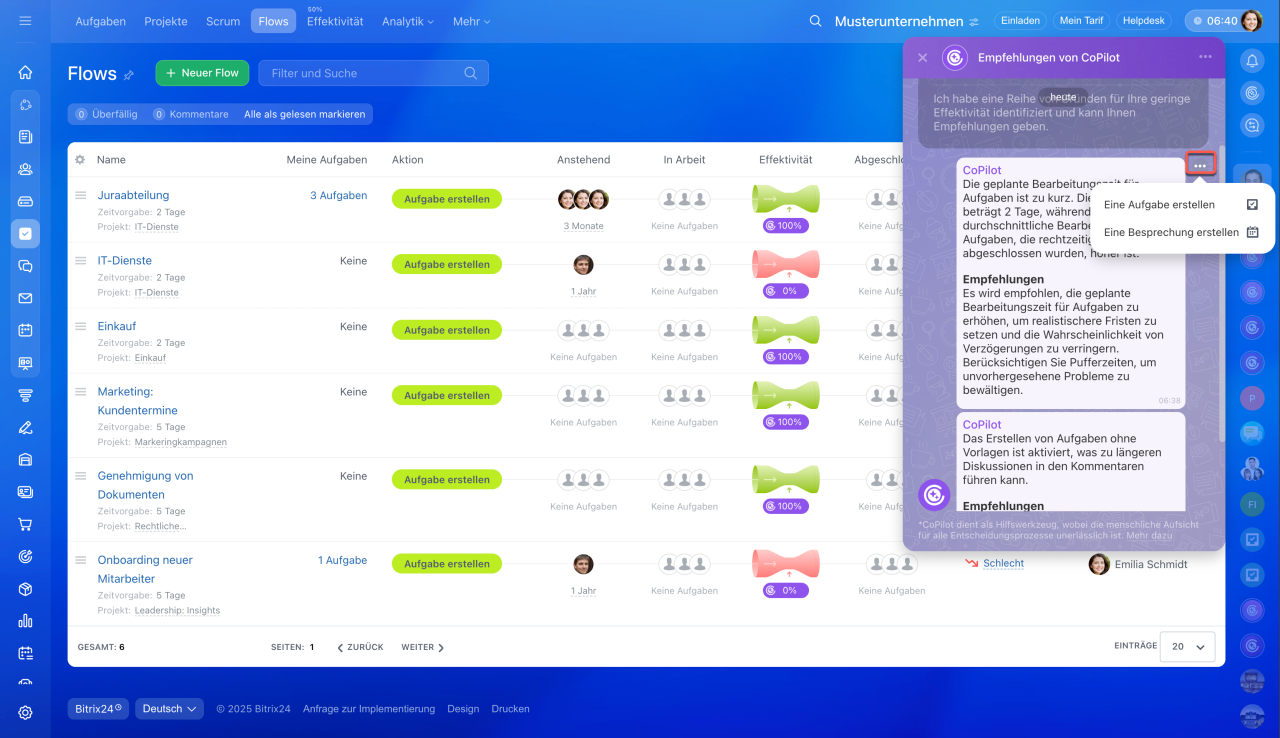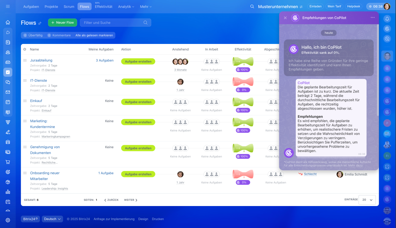 Bitrix24 Flows werden jetzt vom KI-Assistenten CoPilot unterstützt. Er analysiert den Flow, identifiziert die Ursachen für Effizienzverluste und erstellt Empfehlungen zur Optimierung Ihrer Arbeitsprozesse.