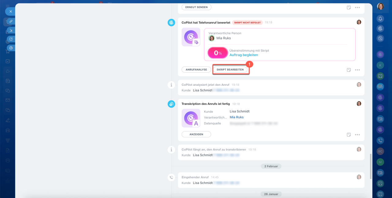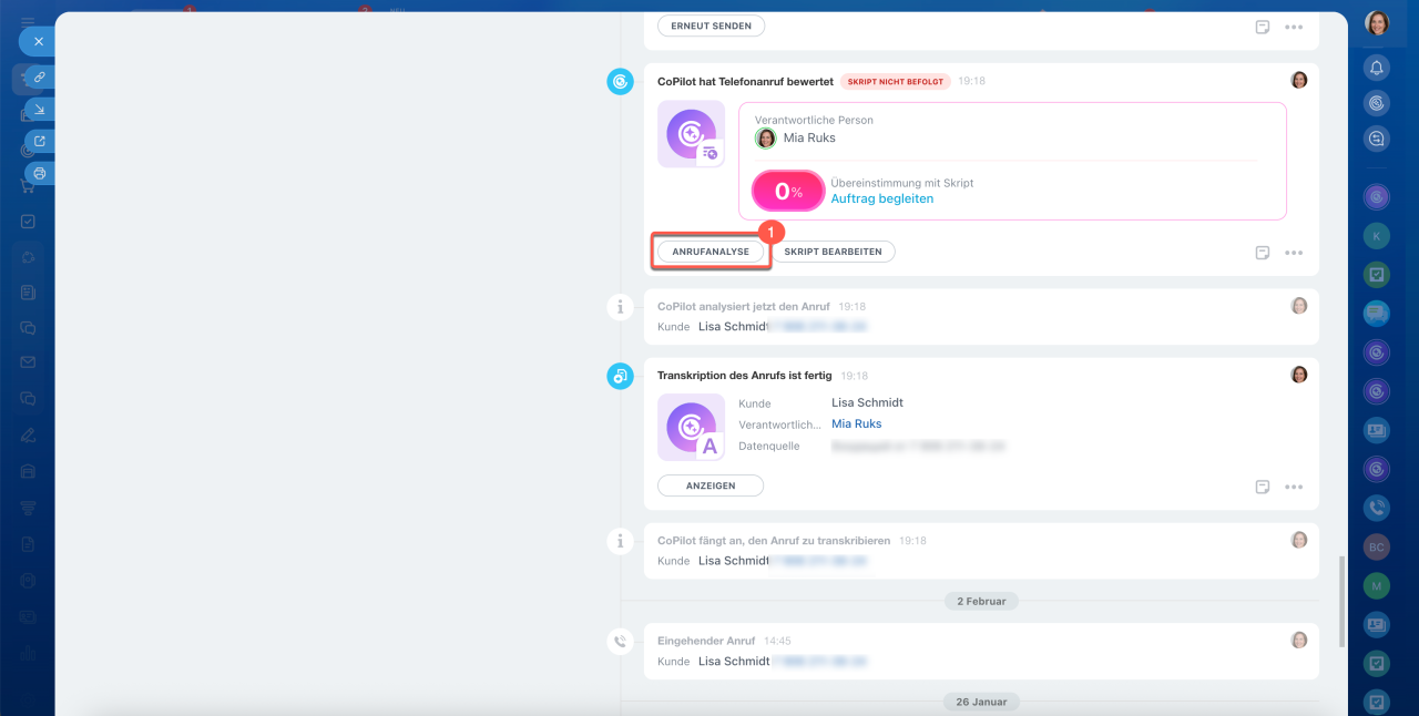 Wenn es nicht erforderlich ist, die Felder im Formular des CRM-Elements auszufüllen, klicken Sie auf den Button CoPilot und wählen Sie die Aktion Anruf analysieren und bewerten.