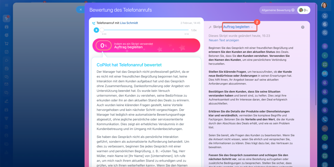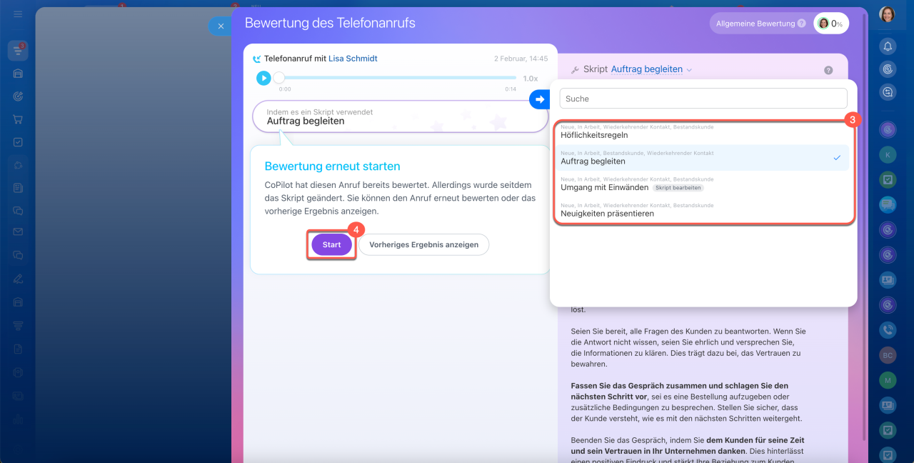 Verkaufsskript. CoPilot bewertet den Anruf anhand dieses Skripts. Ein Anruf kann nach mehreren Skripts bewertet werden. Wählen Sie dazu ein anderes Skript im Analysefenster aus und starten Sie die Bewertung erneut.