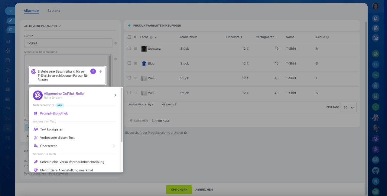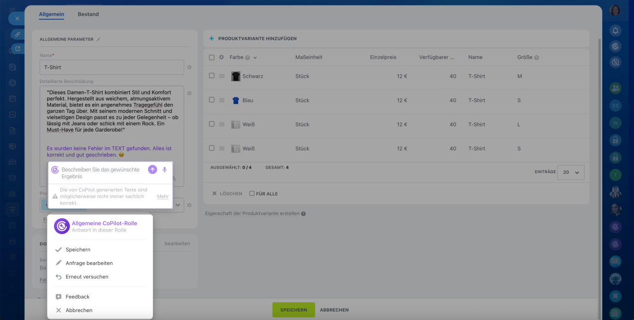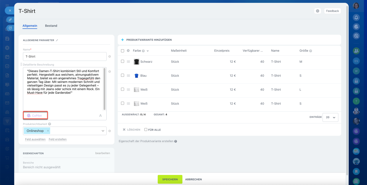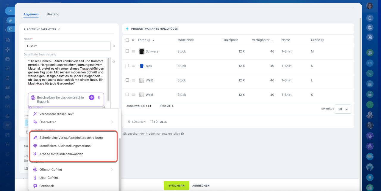 - CoPilot ist in jedem Produktformular im Feld Detaillierte Beschreibung eingebettet.