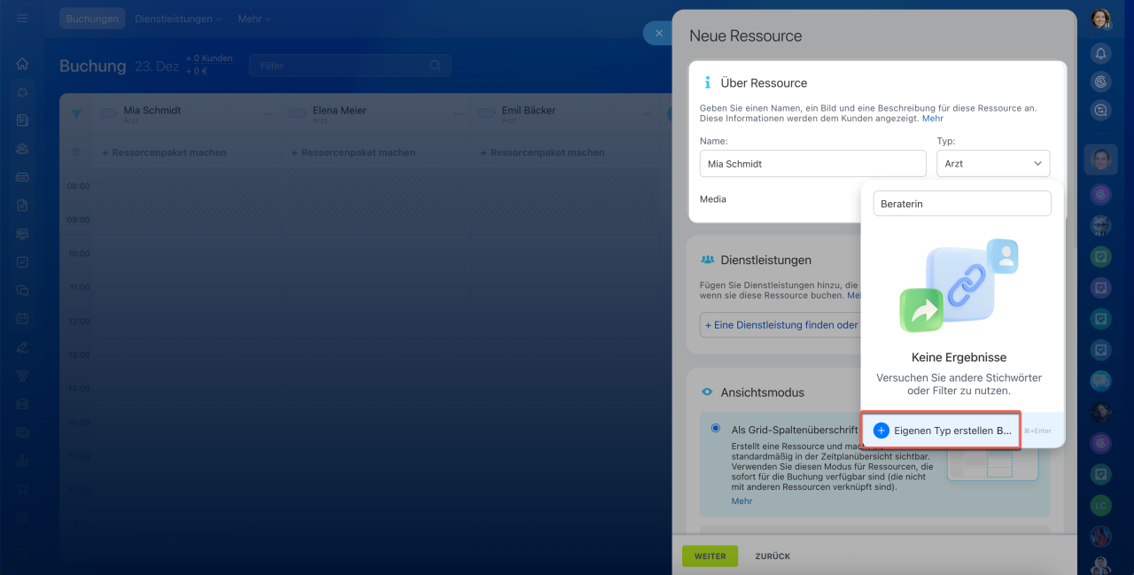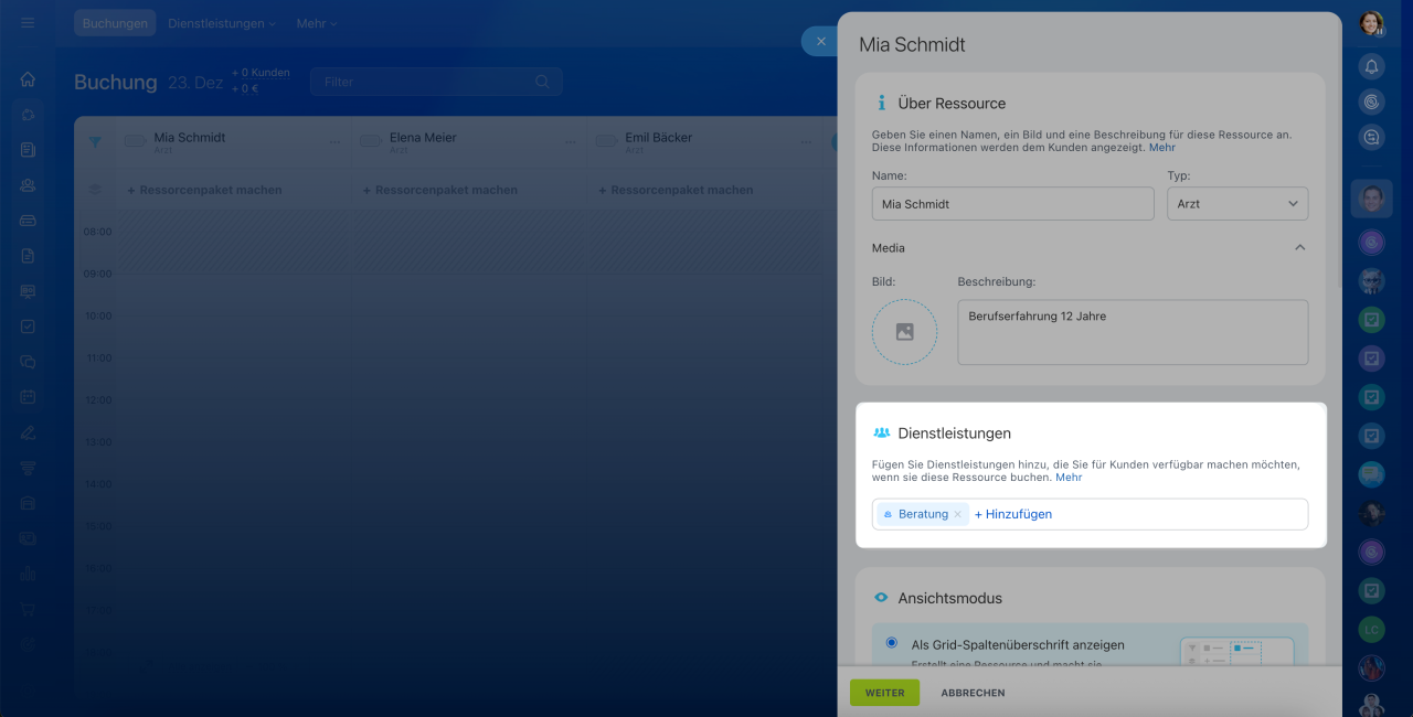 Dienstleistungen. Erstellen oder wählen Sie Dienstleistungen aus, die mit dieser Ressource verknüpft werden sollen. Sie können Sie zum Beispiel für die Ressource „Mia Schmidt, Ärztin“ die Dienstleistungen „Allgemeinmedizinische Beratung“ und „Endokrinologische Beratung“ hinzufügen. Kunden sehen diese Dienstleistungen bei der Terminbuchung, und der Mitarbeier sieht sie im Buchungsformular. Dienstleistungen, die im Bereich Buchung erstellt werden, erscheinen automatisch im CRM-Produktkatalog.