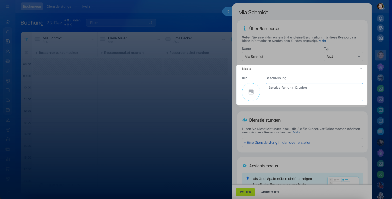 Media. Fügen Sie ein Bild und eine kurze Beschreibung hinzu – dies hilft den Kunden, mehr über die Ressource zu erfahren, bevor sie einen Termin buchen. Beispielsweise können Sie ein Foto des Spezialisten hochladen und Informationen zu seiner Ausbildung hinzufügen.