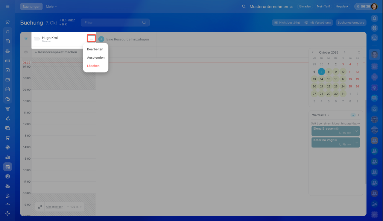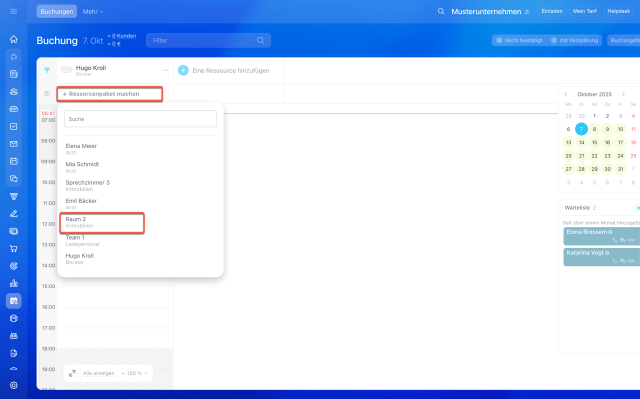 Die hinzugefügten Ressourcen können Sie für Kundenterminbuchungen auswählen und die Verfügbarkeit nachverfolgen.