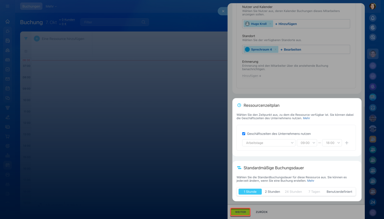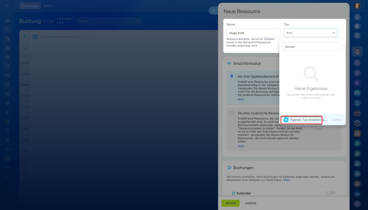 - Um eine Ressource zu erstellen, wählen Sie seinen Typ aus, richten Sie die Parameter ein und aktivieren Sie die Buchungsbenachrichtigungen für die Kunden.