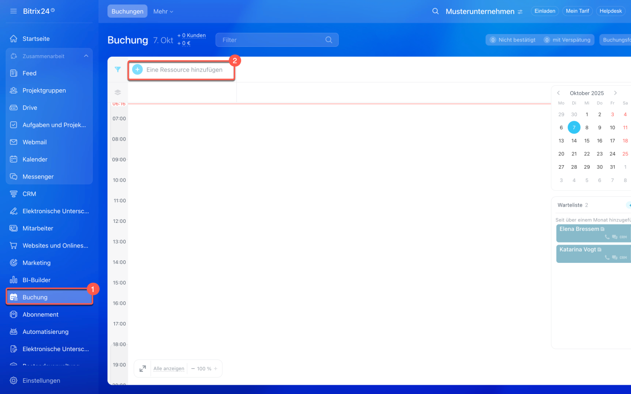 Buchung ist das neue Bitrix24-Tool zur Online-Terminvereinbarung sowie zur Reservierung von Geräten und Ausrüstung. Bevor Kunden Termine bei Ihnen buchen können, sollten Sie Ressourcen erstellen und einrichten. Diese können sowohl personelle Ressourcen wie Ärzte oder Handwerker als auch Geräte, Mieträume usw. umfassen.