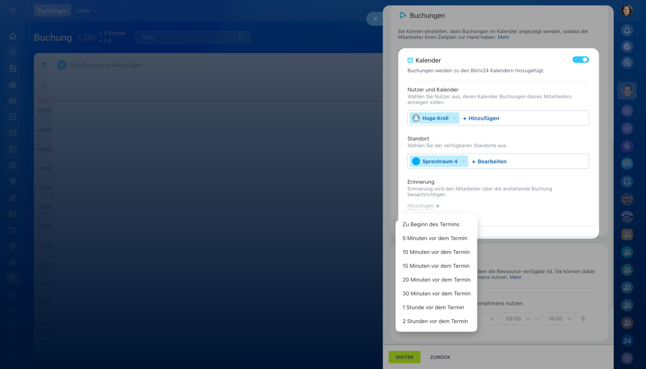 Buchungen. Aktivieren Sie die Option Kalender, um die Buchung mit dem Bitrix24-Kalender zu verknüpfen. Dadurch werden alle Termine automatisch in den persönlichen Kalendern der Mitarbeiter angezeigt. Spezialisten sehen sofort ihren Zeitplan und müssen nicht an verschiedenen Orten nach Terminen suchen. Passen Sie die Einstellungen an: