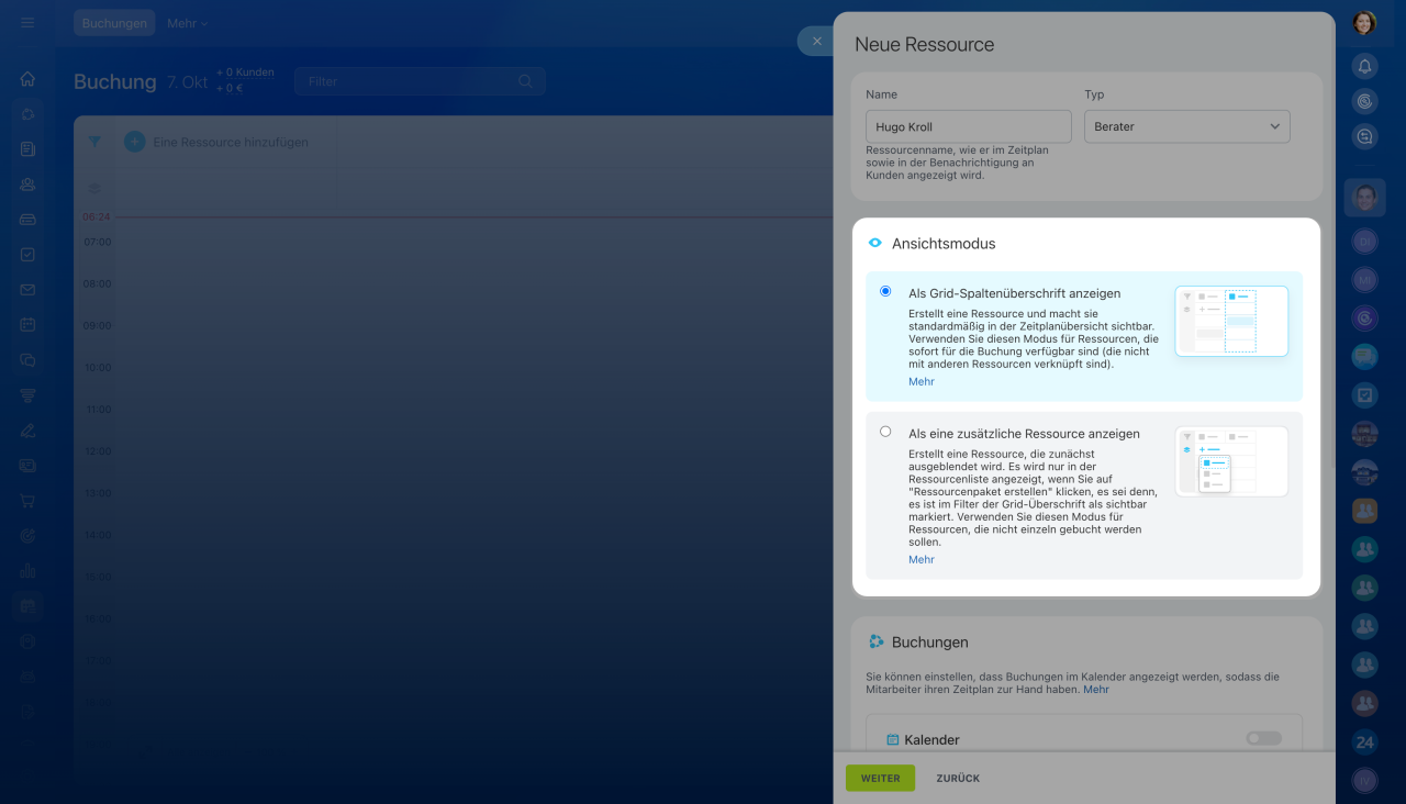 - Als Spaltenüberschrift im Grid anzeigen: Die Ressource wird immer im Grid sichtbar sein. Wählen Sie diese Ansicht für Hauptressourcen, die von Kunden gebucht werden, wie Fachkräfte oder Mietfahrzeuge.