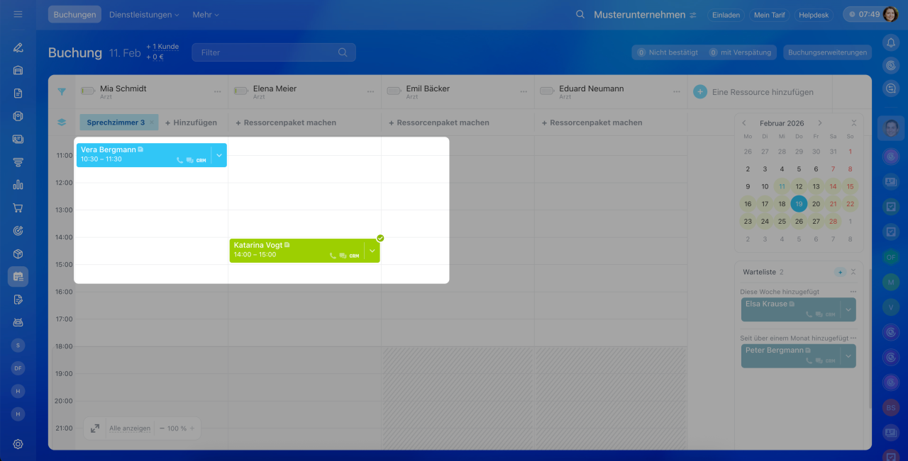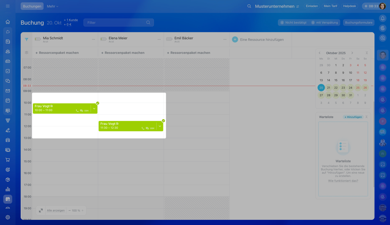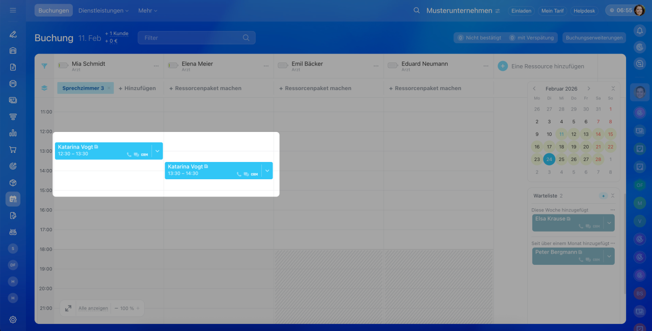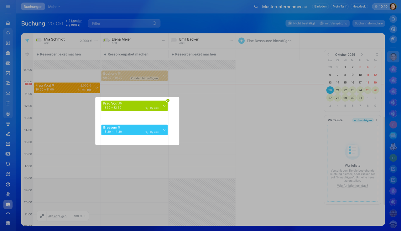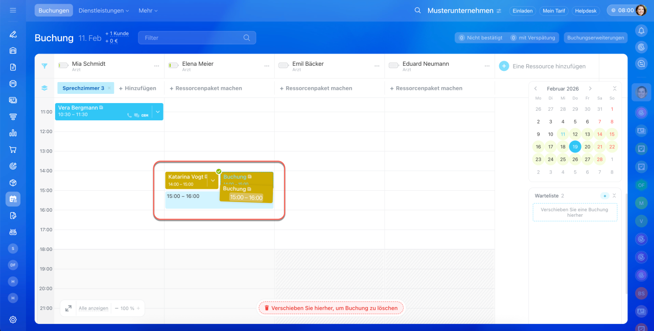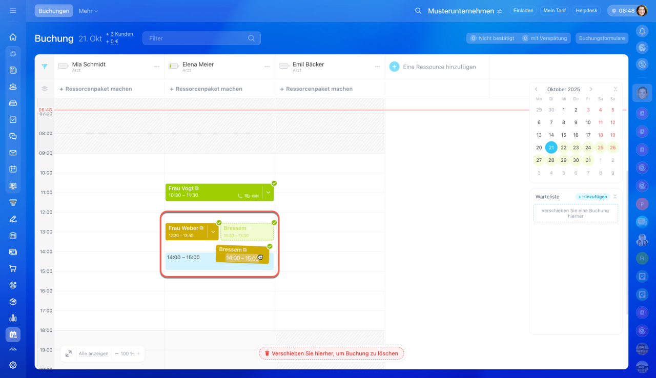 Buchung verschieben: Klicken Sie die bestehende Buchung an, halten Sie die Maustaste gedrückt und ziehen Sie den Termin auf den bereits belegten Slot.