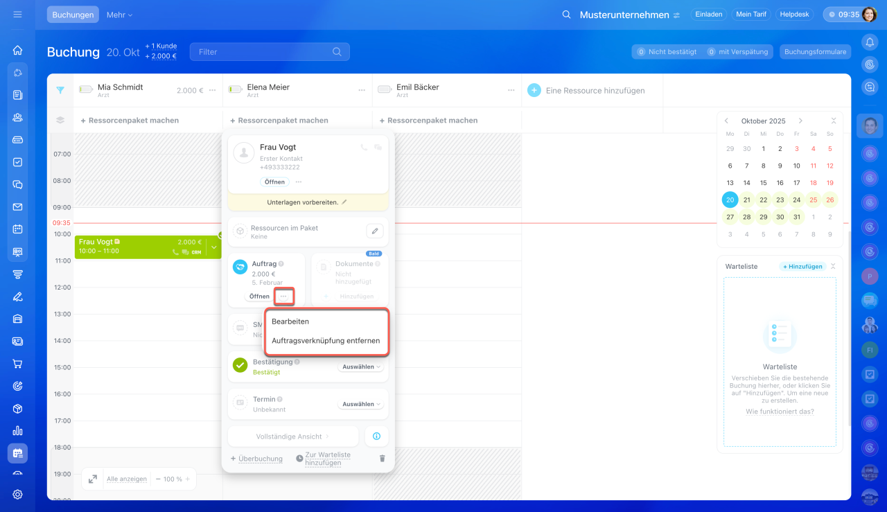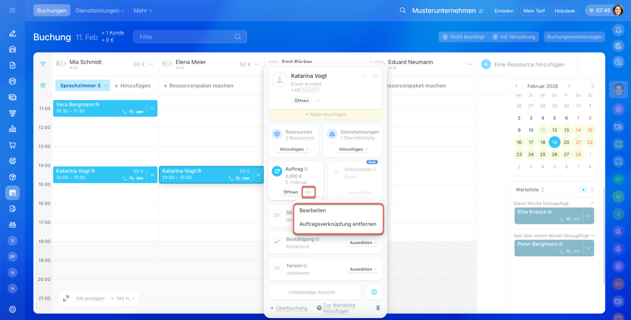 Um den Auftrag aus der Buchung zu löschen oder zu ändern, klicken Sie auf Drei Punkte (...) und wählen Sie die gewünschte Option aus.