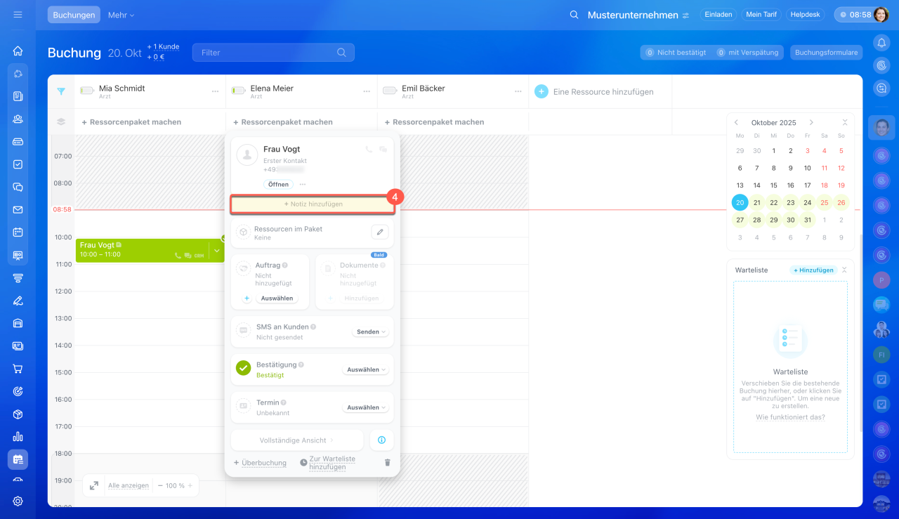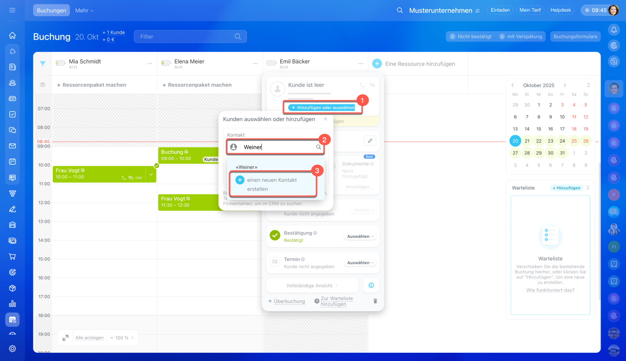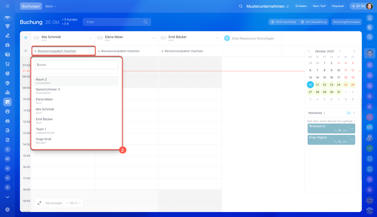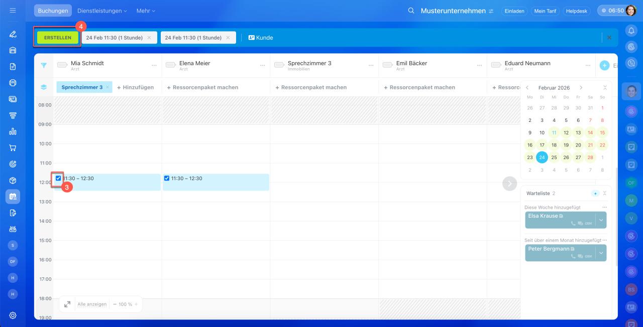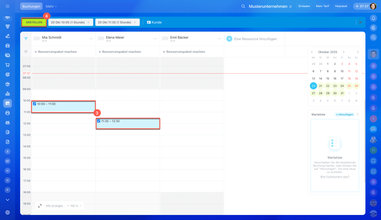 - Wählen Sie die passende Zeit unter der gewünschten Ressource und klicken Sie auf Erstellen. Für einen Kunden ist es möglich, gleich mehrere Buchungen hinzuzufügen.