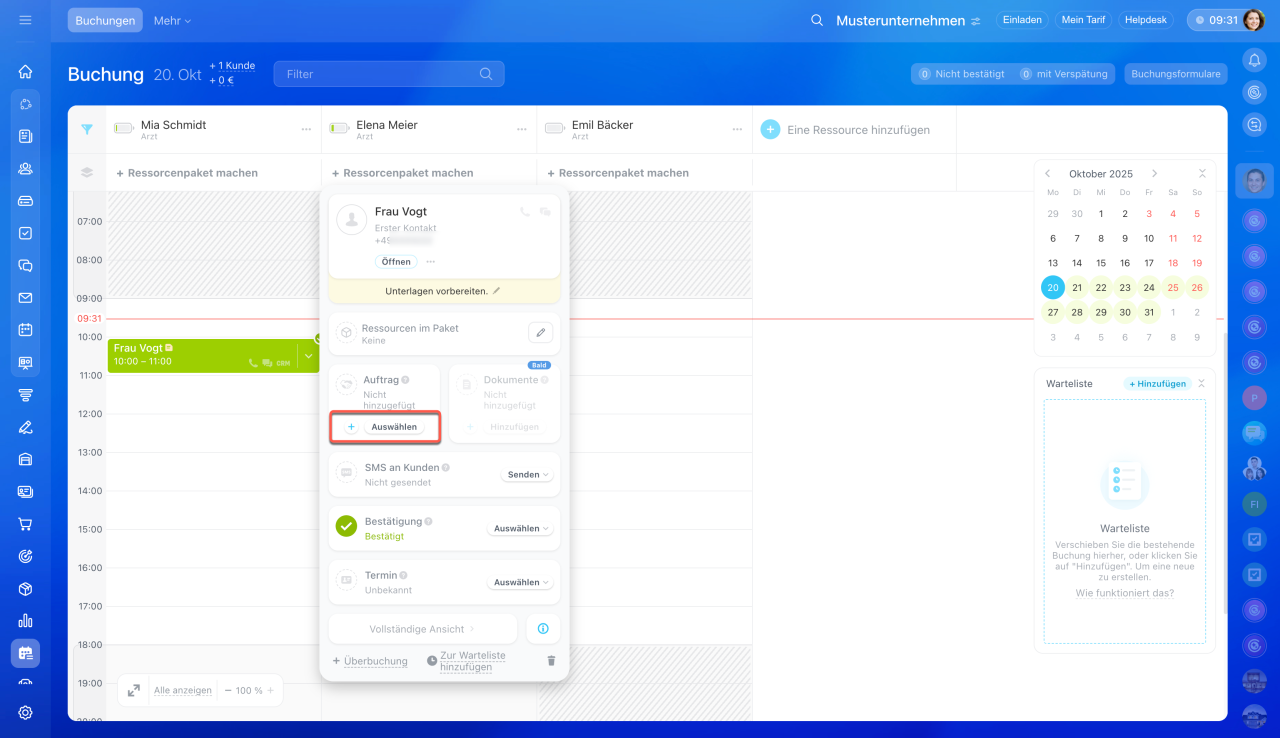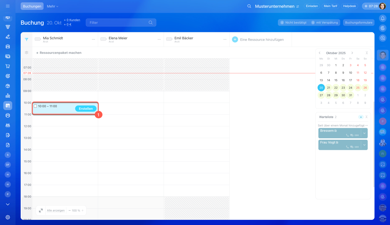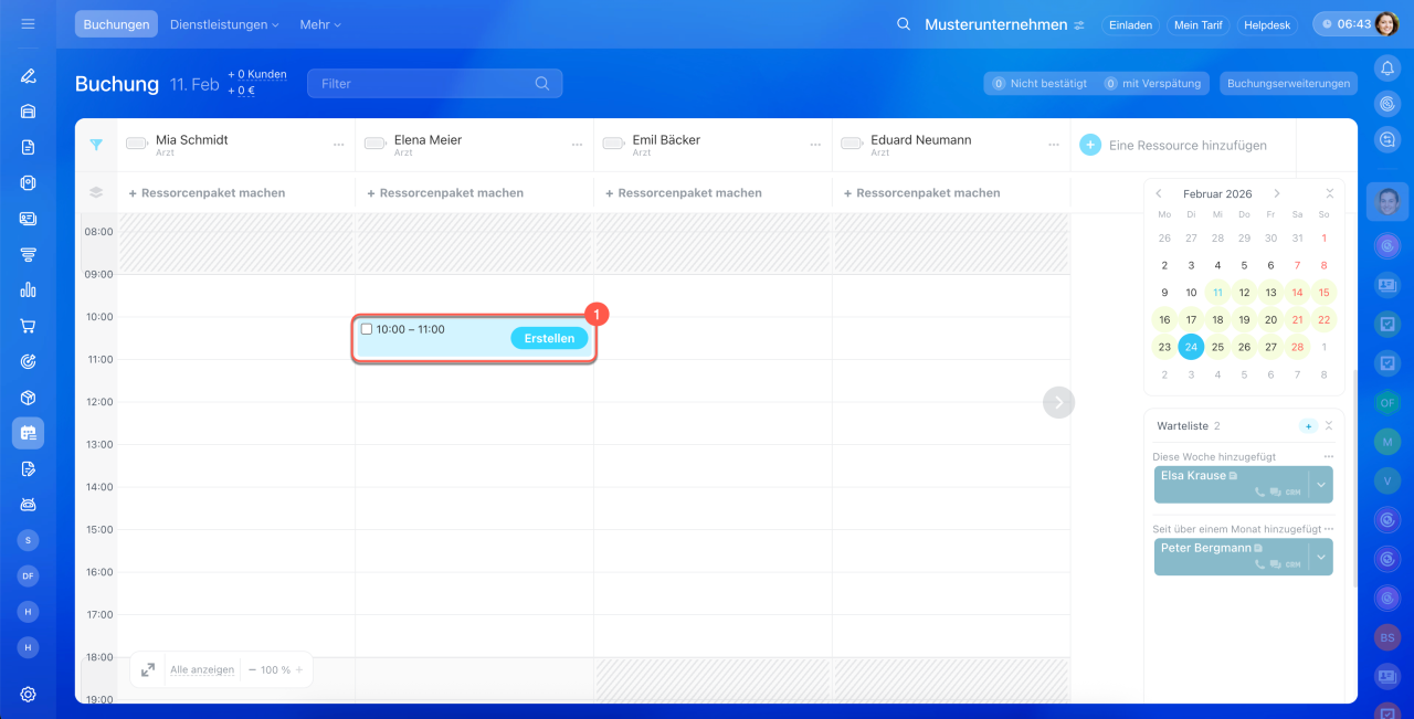 - Wählen Sie die passende Uhrzeit unter der gewünschten Ressource und klicken Sie auf Erstellen.