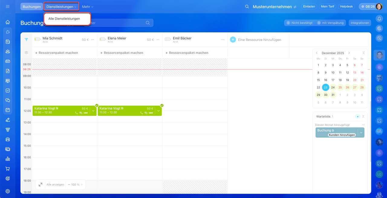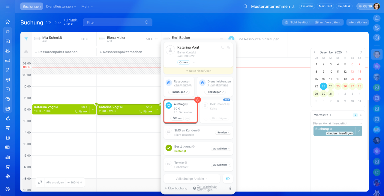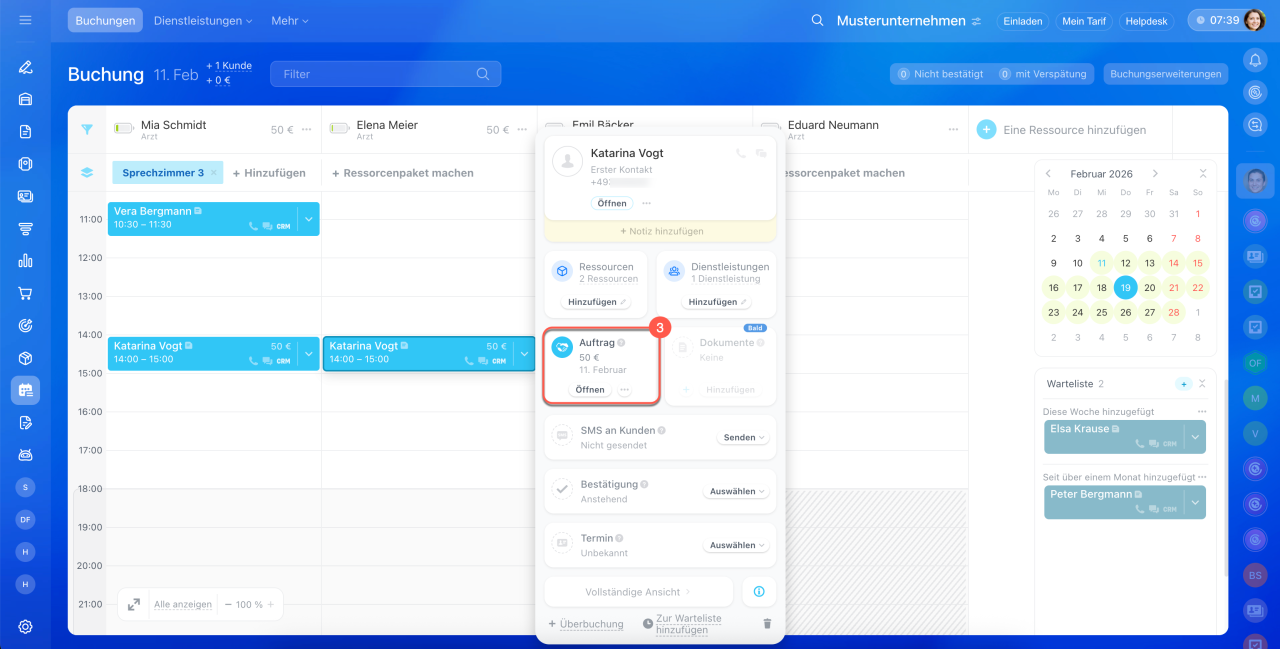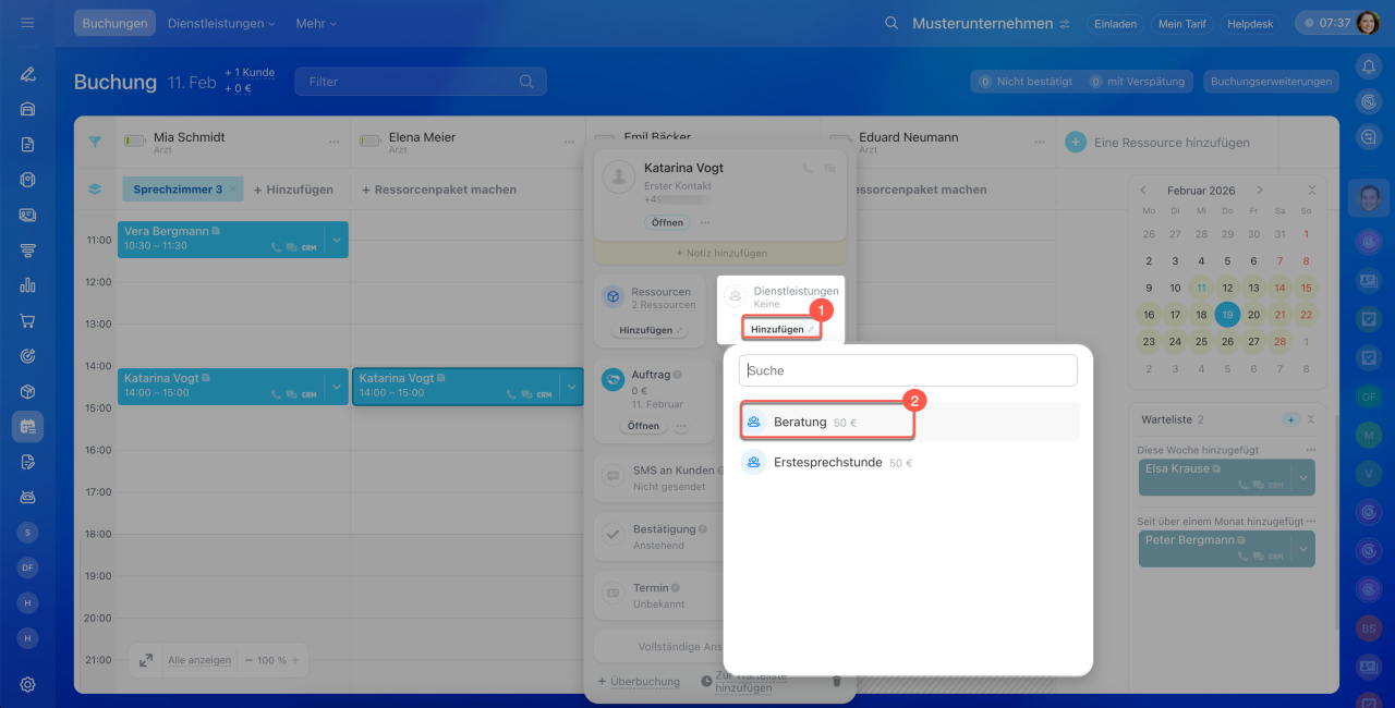 3–4. Alle ausgewählten Dienstleistungen erscheinen automatisch in den Formularen der Buchung und des Auftrags.