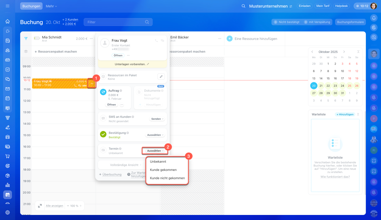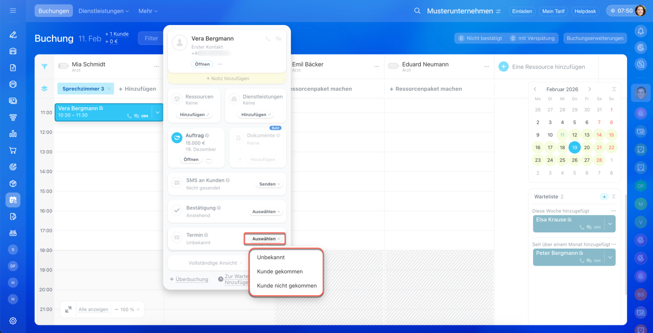 - Wählen Sie den Status aus: Kunde gekommen oder Kunde nicht gekommen.
