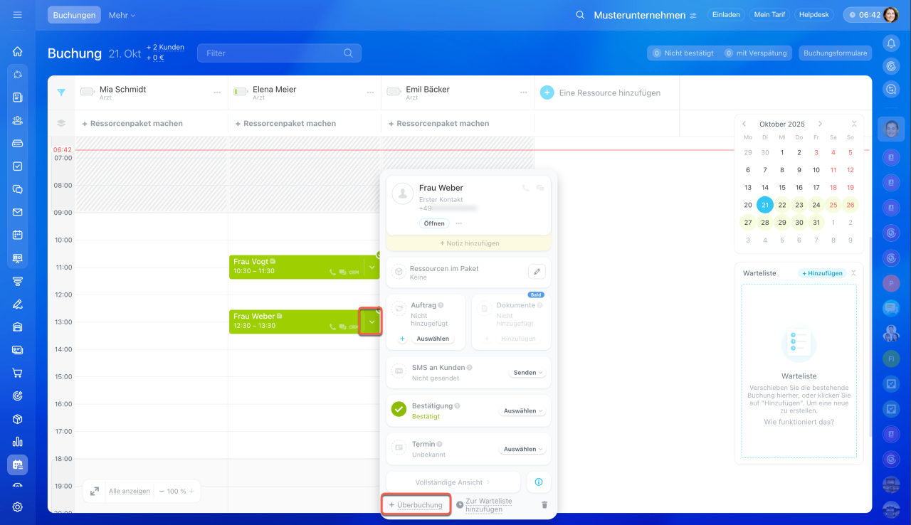 Die Überbuchung ist die Mögluchkeit, 2 Kunden für dieselbe Zeit einzutragen. Wenn einer der Kunden die Buchung stroniert oder verschiebt, wird diese Zeit automatisch für den anderen Kunden reserviert. So vermeiden Sie Leerlauf und nutzen Ihre Unternehmensressourcen optimal.