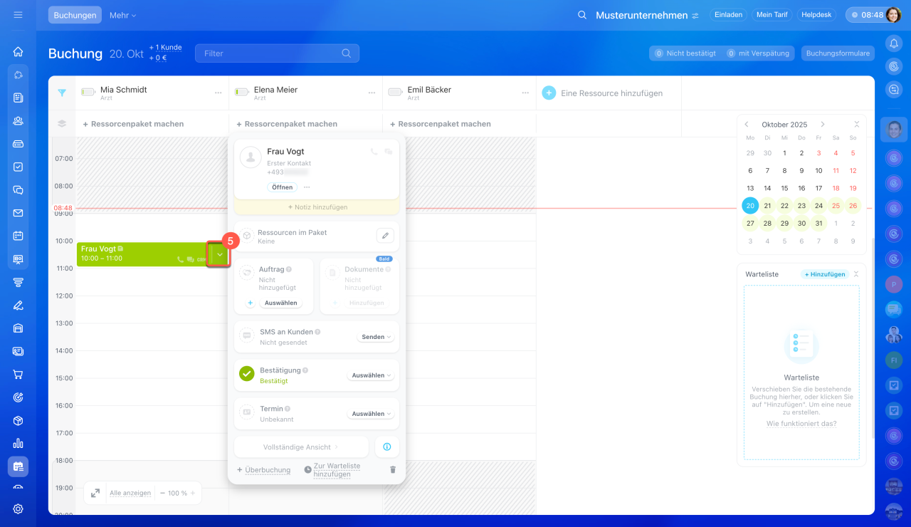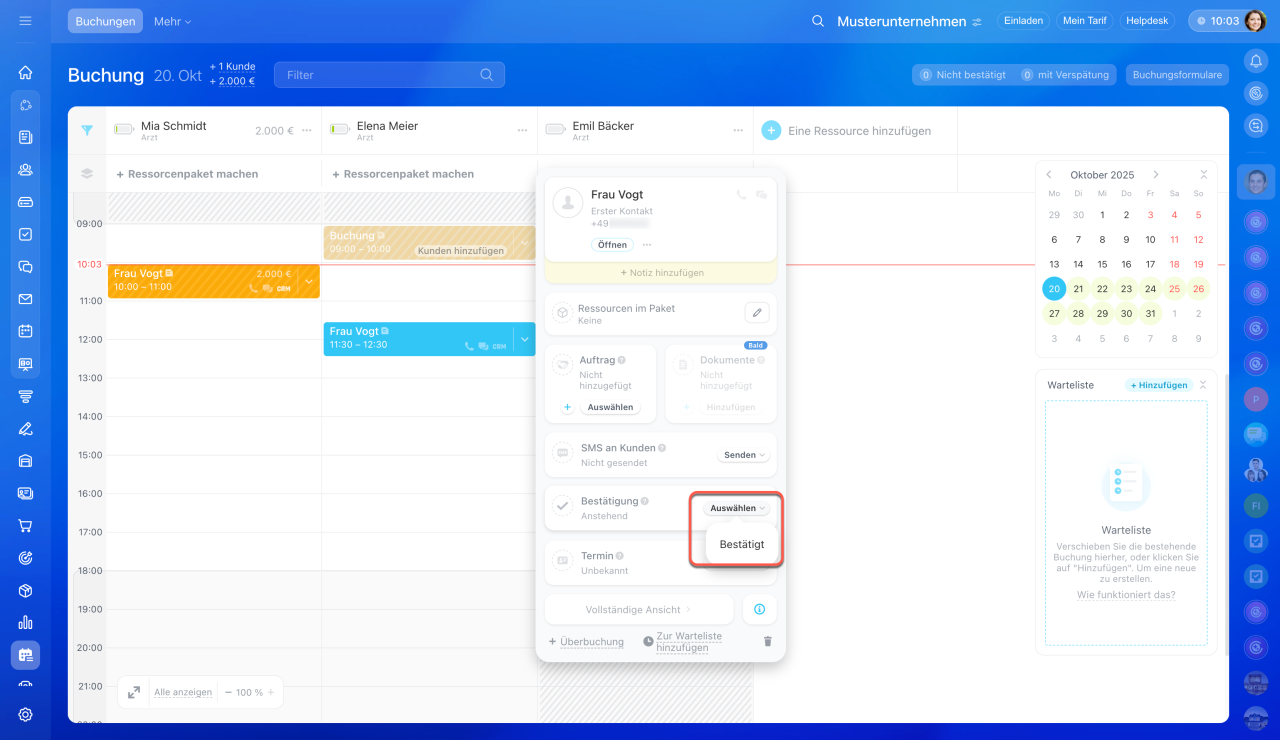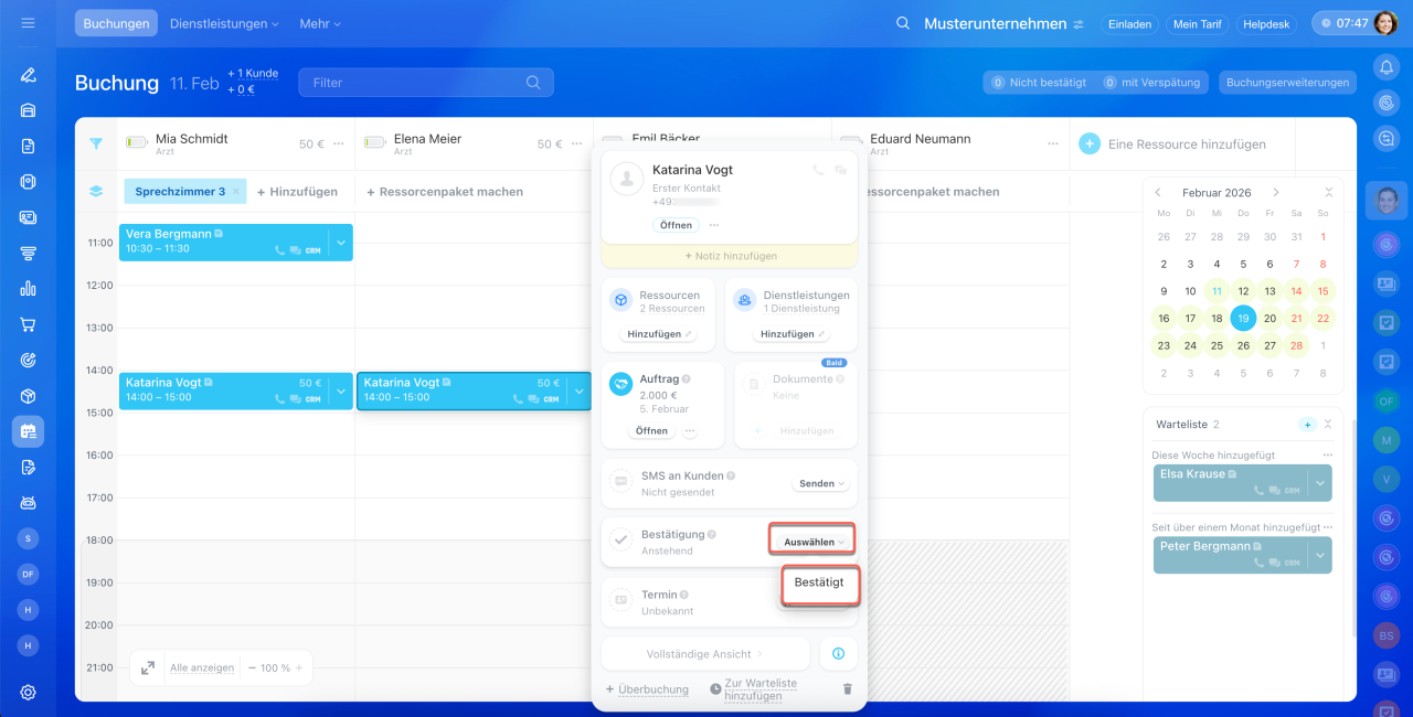 Momentan können Sie die Buchung manuell bestätigen. Wenn der Kunde die Buchung bestätigt hat, klicken Sie auf Auswählen und tippen Sie auf Bestätigt.