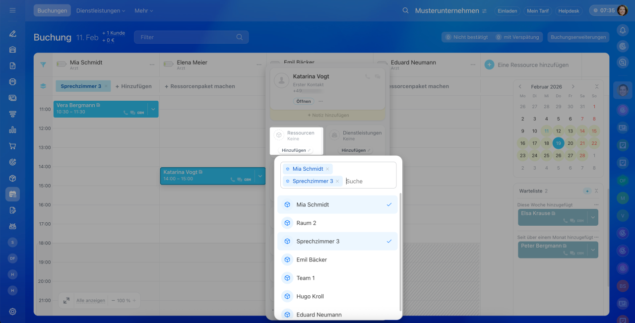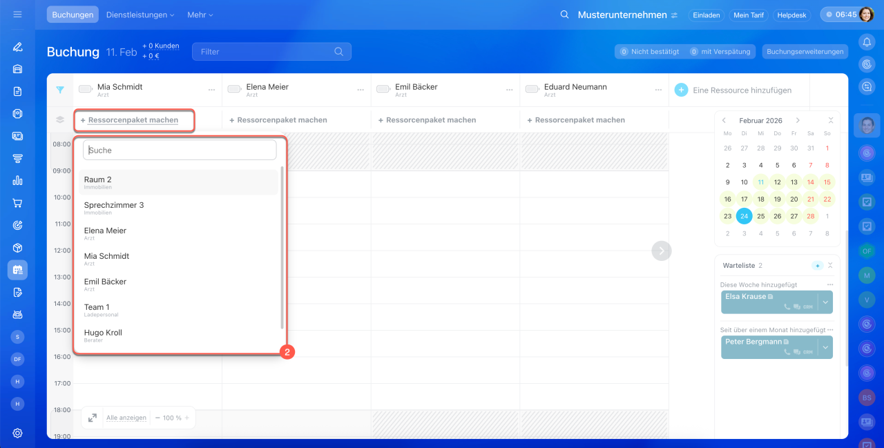 - Klicken Sie auf +komplexe Ressource erstellen, wenn Sie zur Hauptressource eine zusätzliche hinzufügen möchten. Wählen Sie die Ressource aus. So können Sie zum Beispiel einen Arzt und ein Sprechzimmer buchen.