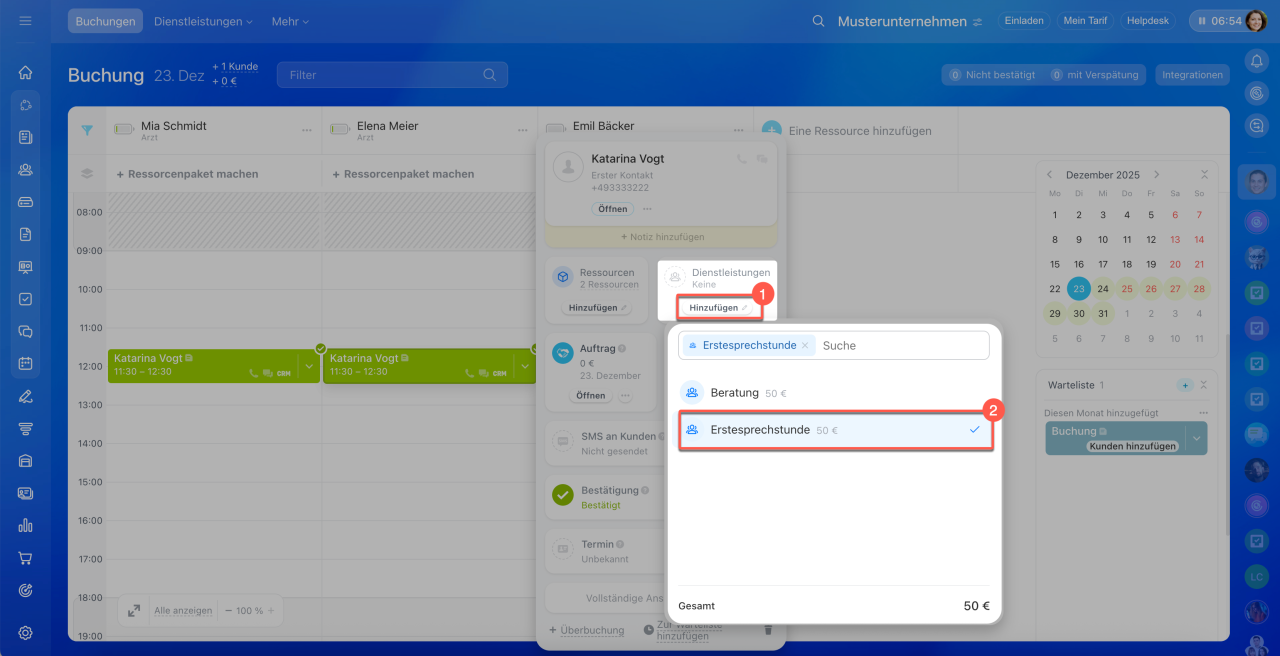 Sie können eine oder mehrere Dienstleistungen auswählen, für die der Kunde einen Termin bucht. In der Buchungskarte wird sofort der Gesamtbetrag angezeigt – der Mitarbeiter kann die gewünschten Positionen hinzufügen und den Endpreis direkt während des Gesprächs mit dem Kunden nennen.
