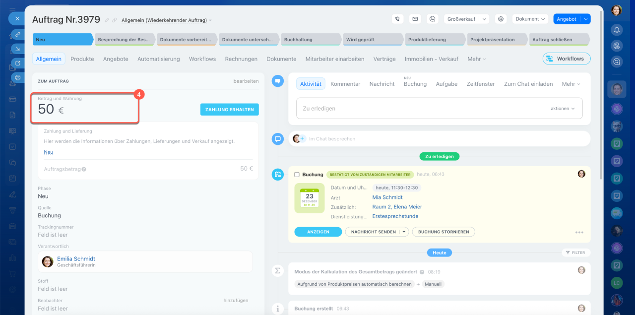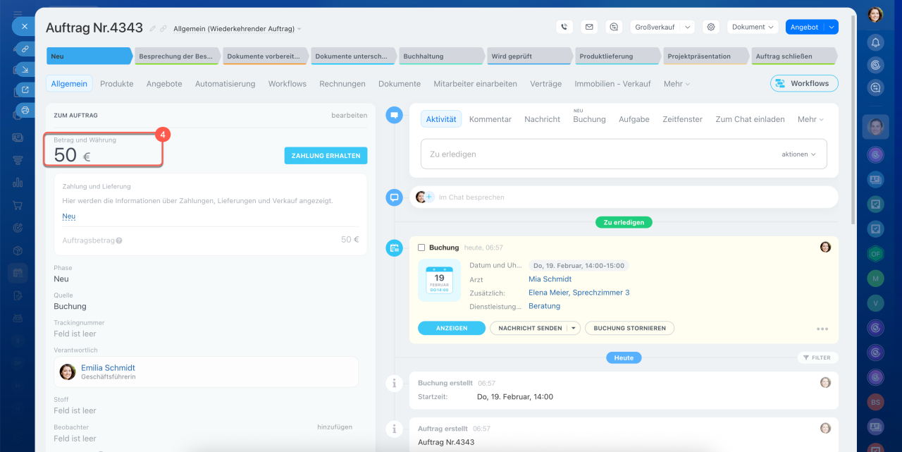 Sie können die Buchung mit einem bestimmten Auftrag im CRM verknüpfen oder einen neuen Auftrag erstellen.
