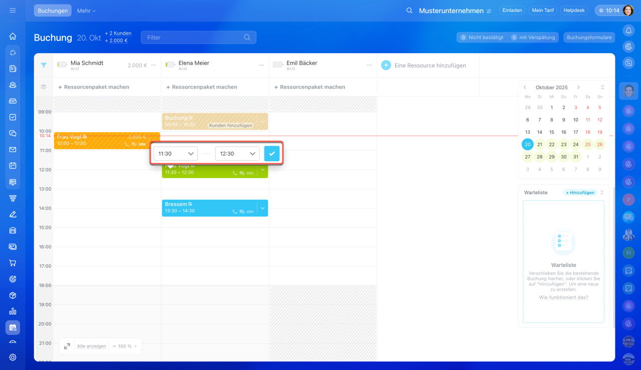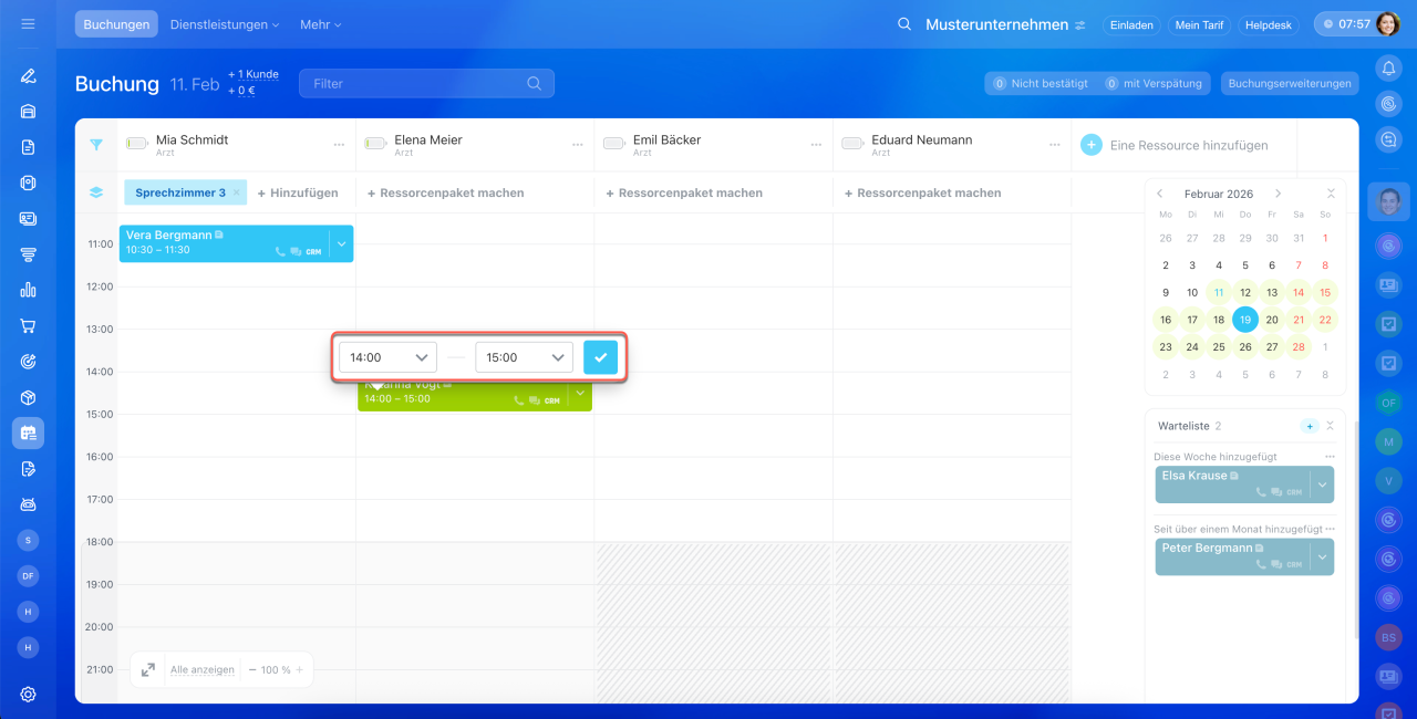 Die Buchung können Sie auf eine andere Uhrzeit verschieben. Klicken Sie dazu auf die Uhrzeit in der Buchung und geben Sie eine neue Zeit an.