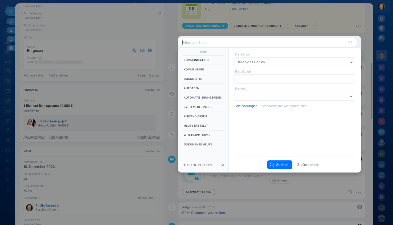 Um Informationen in der Timeline schnell zu finden, nutzen Sie den Filter. Verwenden Sie die Standardfilter oder erstellen Sie eigene. So können Sie die Daten nach Typ, Datum, Autor und Kunden durchsuchen.