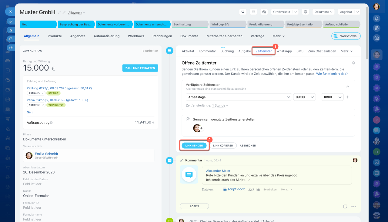 Direkt aus der Timeline können Sie dem Kunden Ihren Kalender senden, damit man selbst ein passendes Datum für den Termin finden kann.