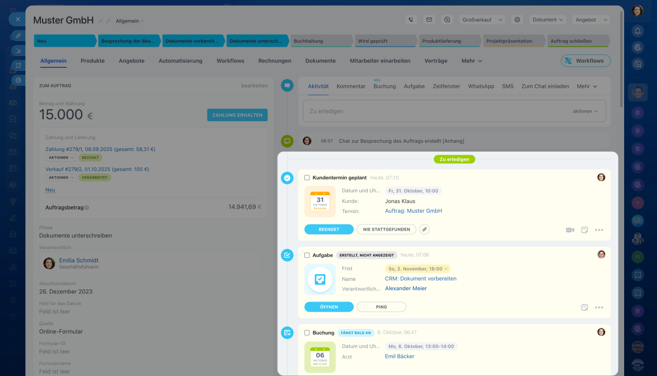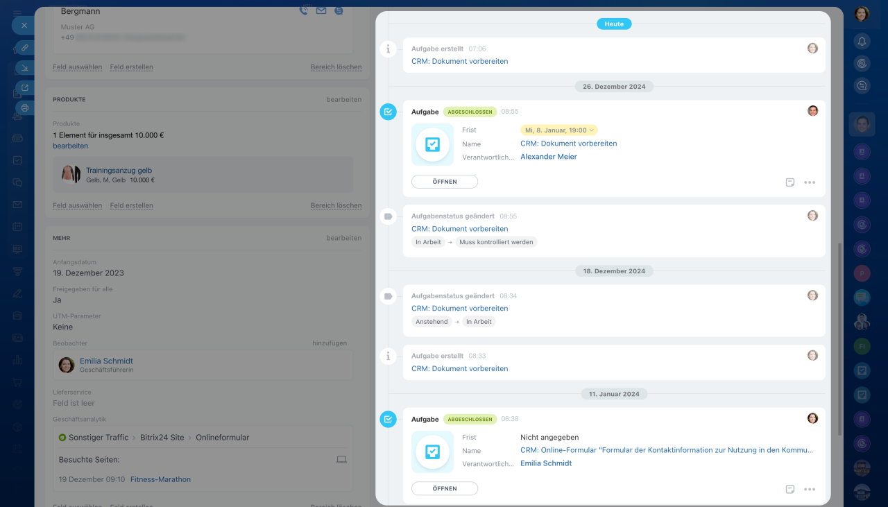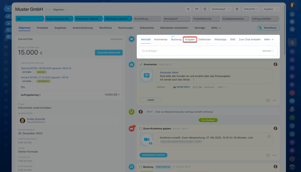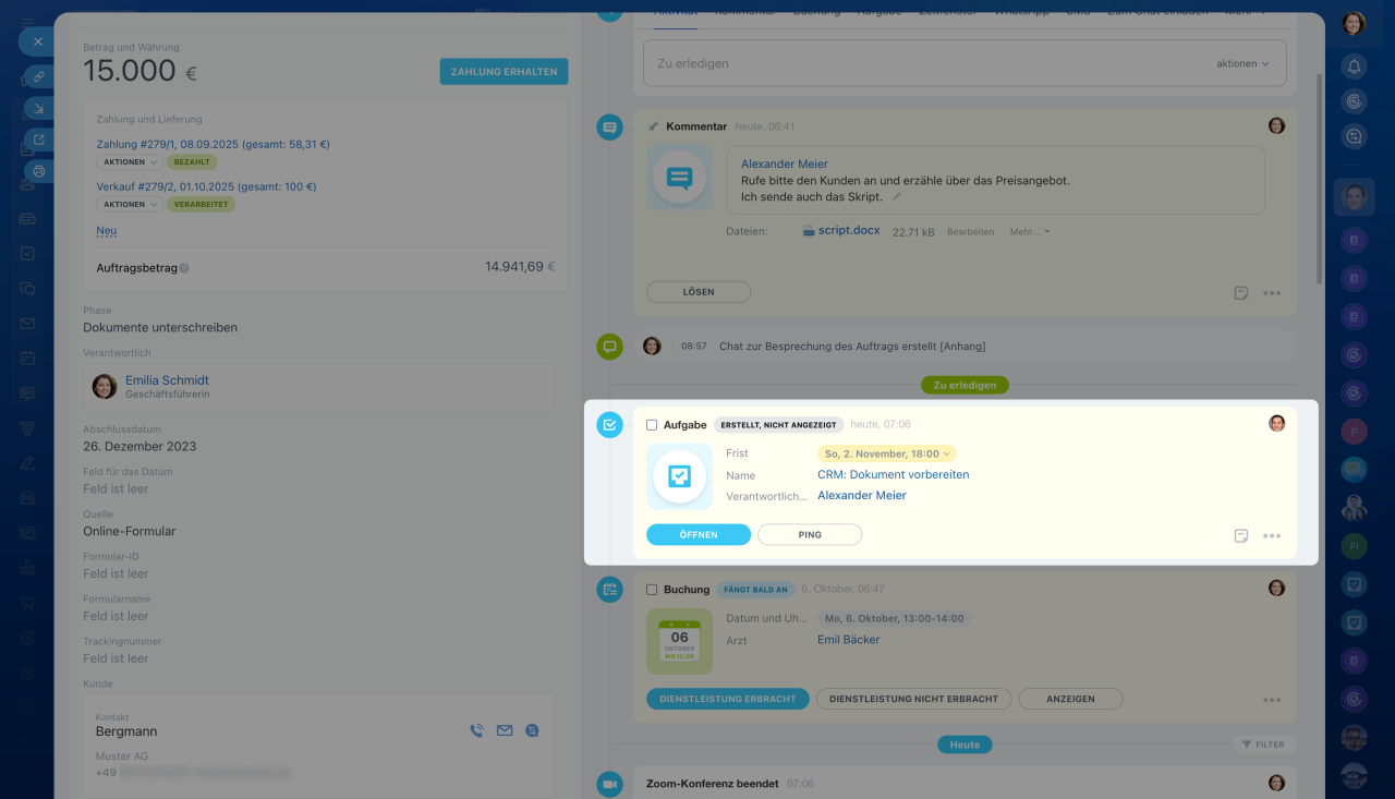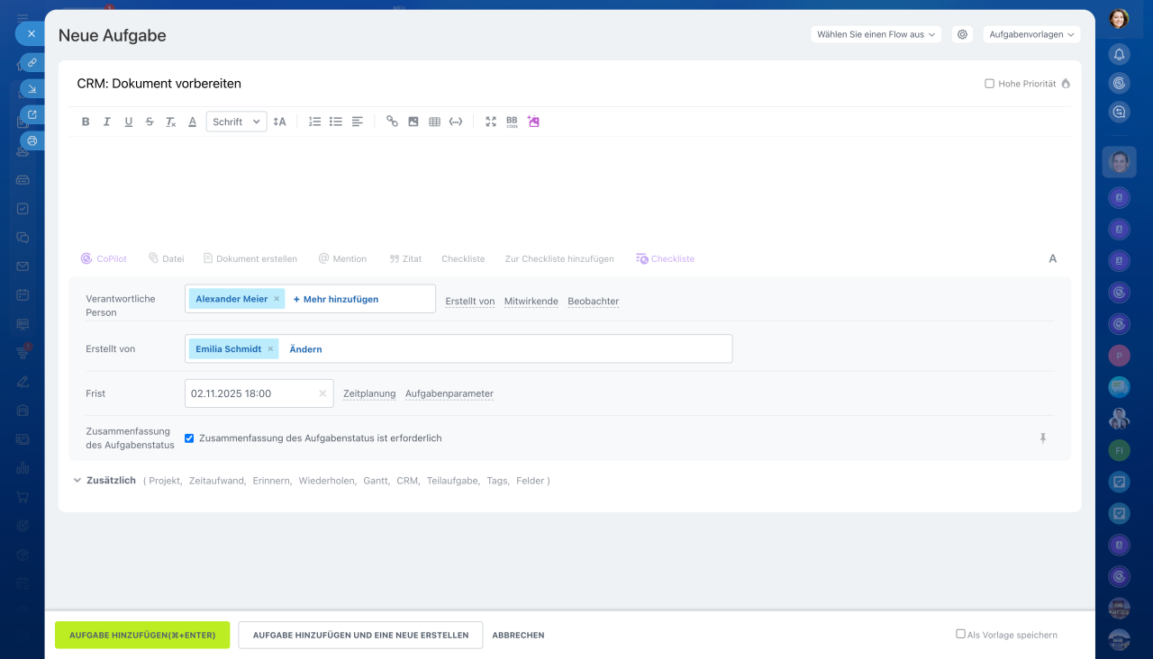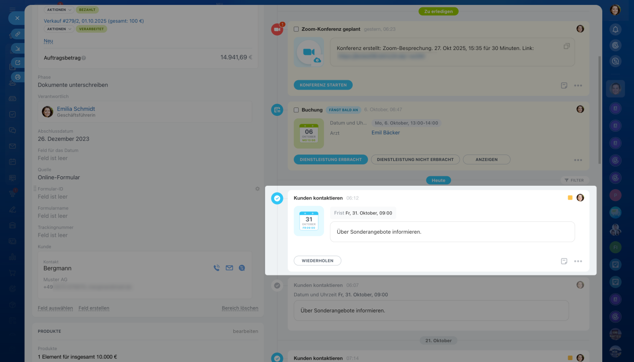 Erstellen Sie Aufgaben, die mit dem Kunden verbunden sind, direkt aus dem Formular des CRM-Elements, wie zum Beispiel die Vorbereitung eines Vertrags oder einer Projektpräsentation.