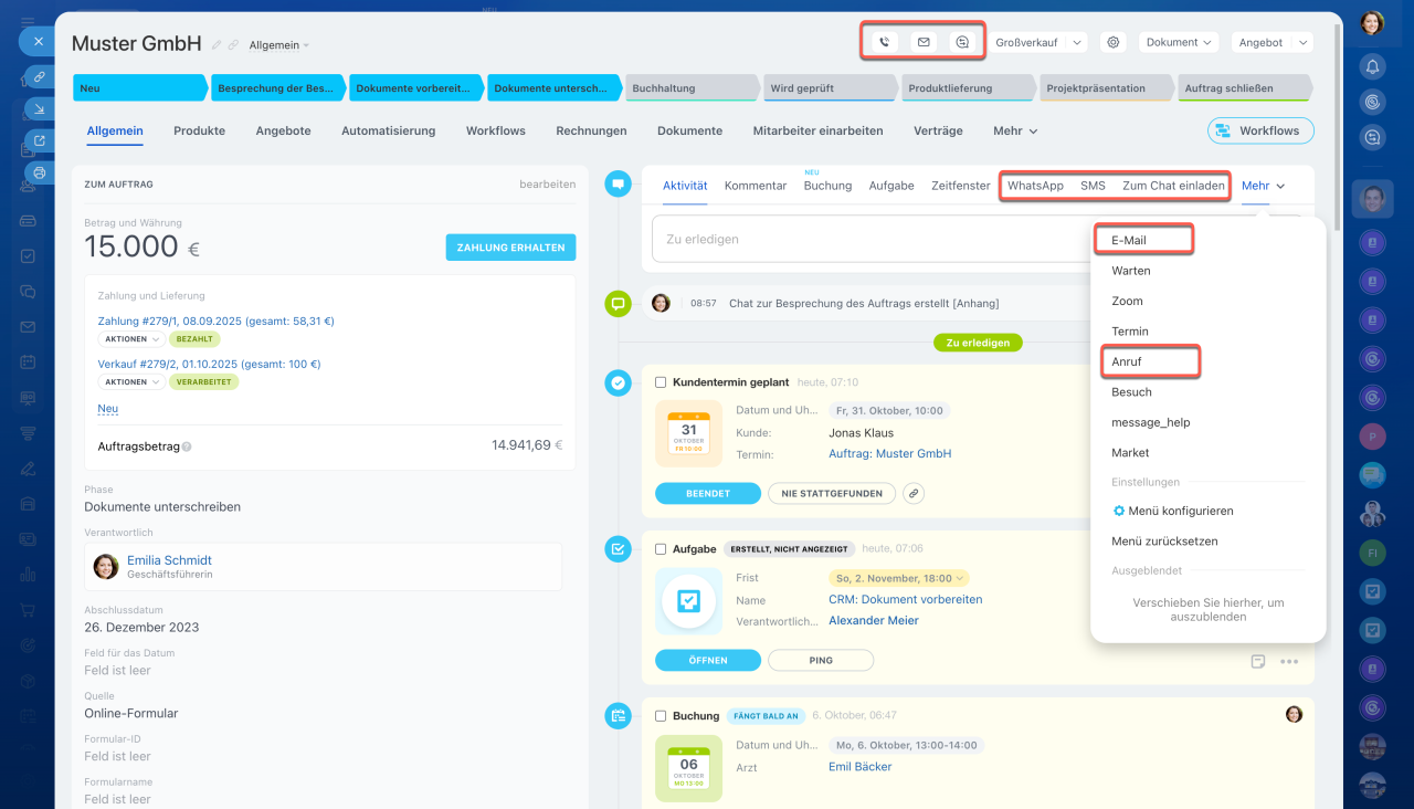 - Aus dem Formular des CRM-Elements heraus können Sie den Kunden anrufen, ihm eine E-Mail oder SMS senden und ihn in den Messenger einladen. Der Kommunikationsverlauf wird in der Timeline gespeichert.