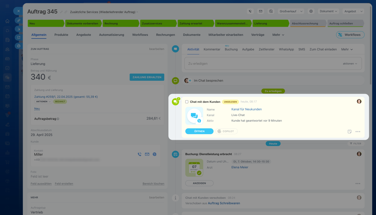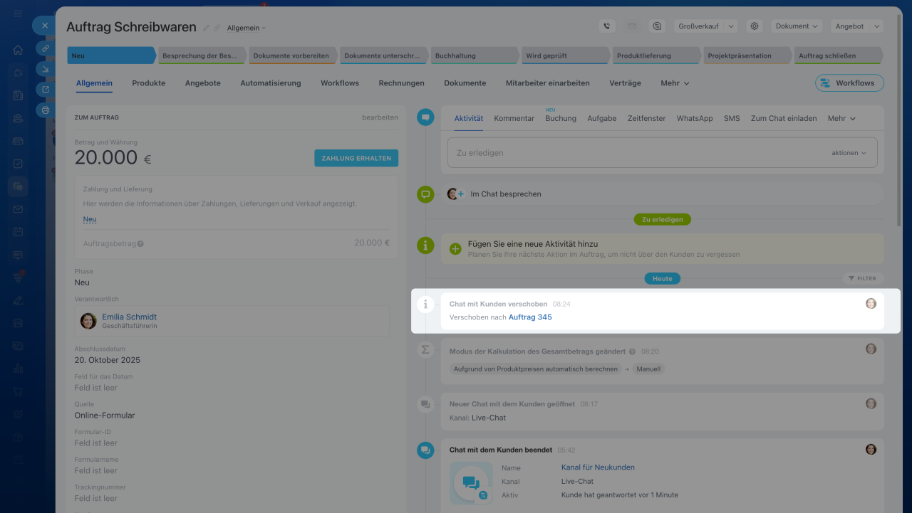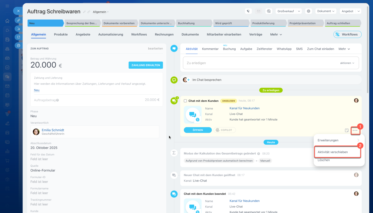 Direkt aus dem Formular eines CRM-Elements können Sie eine offene Aktivität – einen Anruf, eine E-Mail oder einen Chat aus einem Kommunikationskanal – in ein anderes CRM-Element desselben Typs verschieben, zum Beispiel von einem Auftrag zu einem anderen.