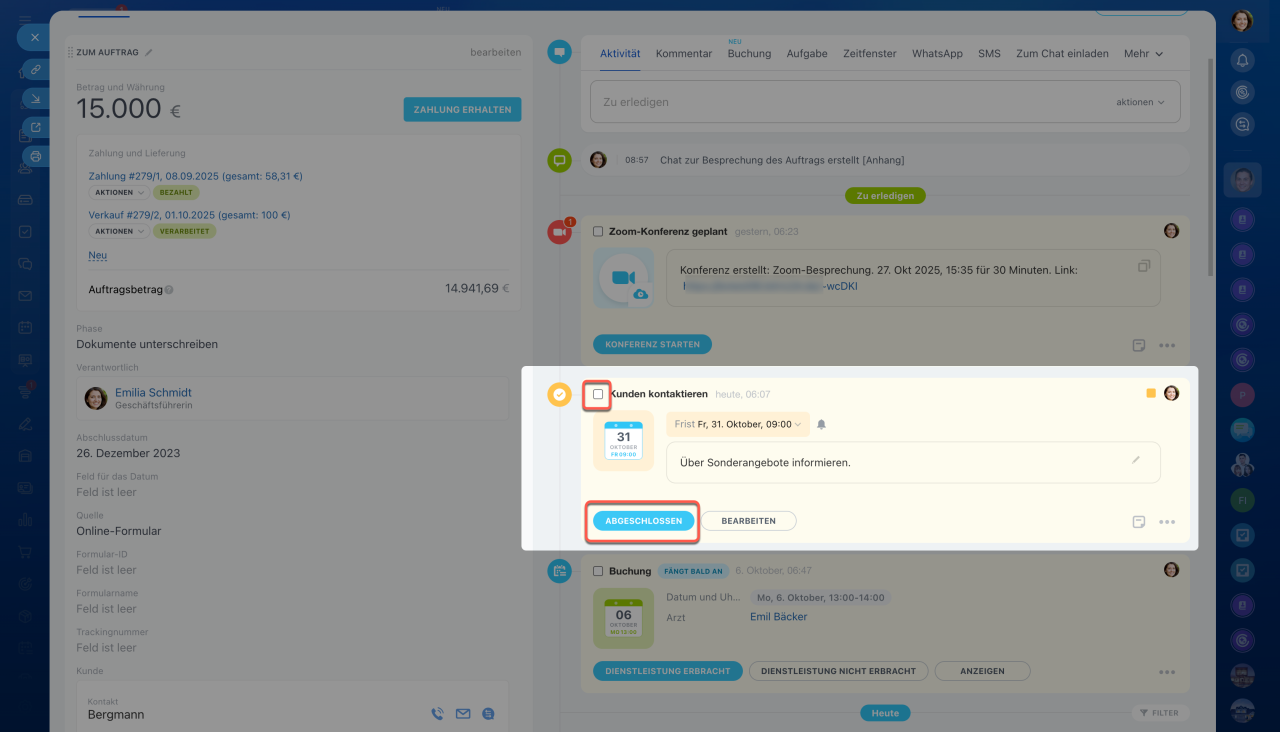 Aktivität erledigen. Nachdem Sie den Kunden kontaktiert haben, können Sie die Aktivität abschließen. Setzen Sie dazu ein Häkchen in die Checkbox oder klicken Sie auf die Schaltfläche Abgeschlossen. Die Informationen zur erledigten Aktivität werden in der Timeline des Formulars angezeigt.