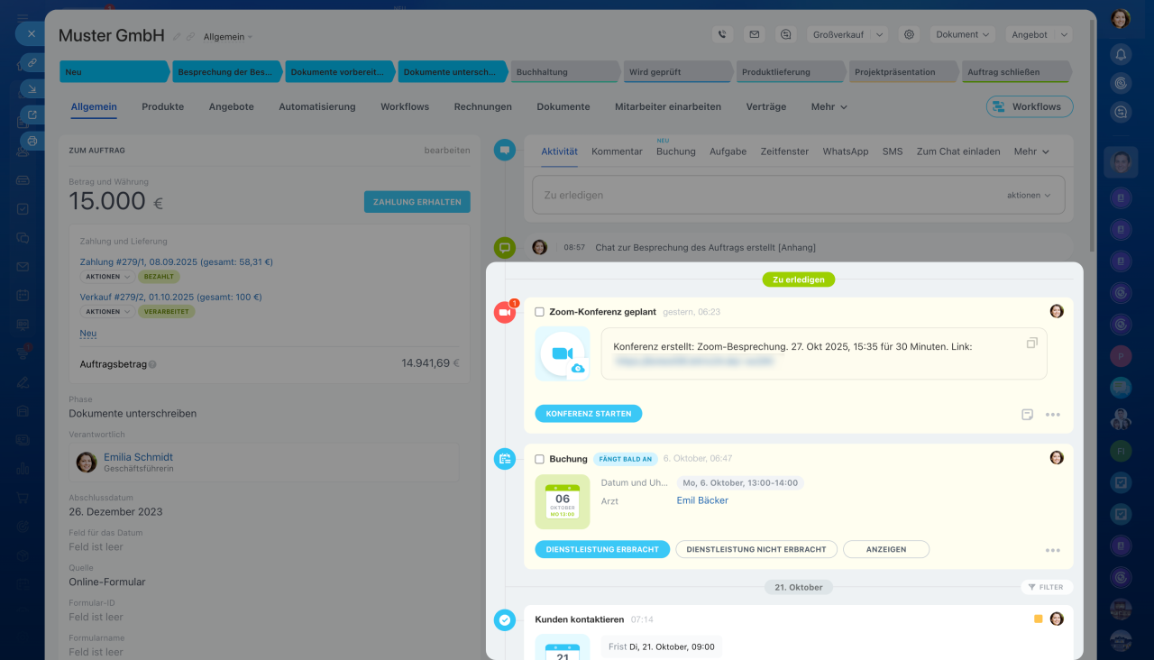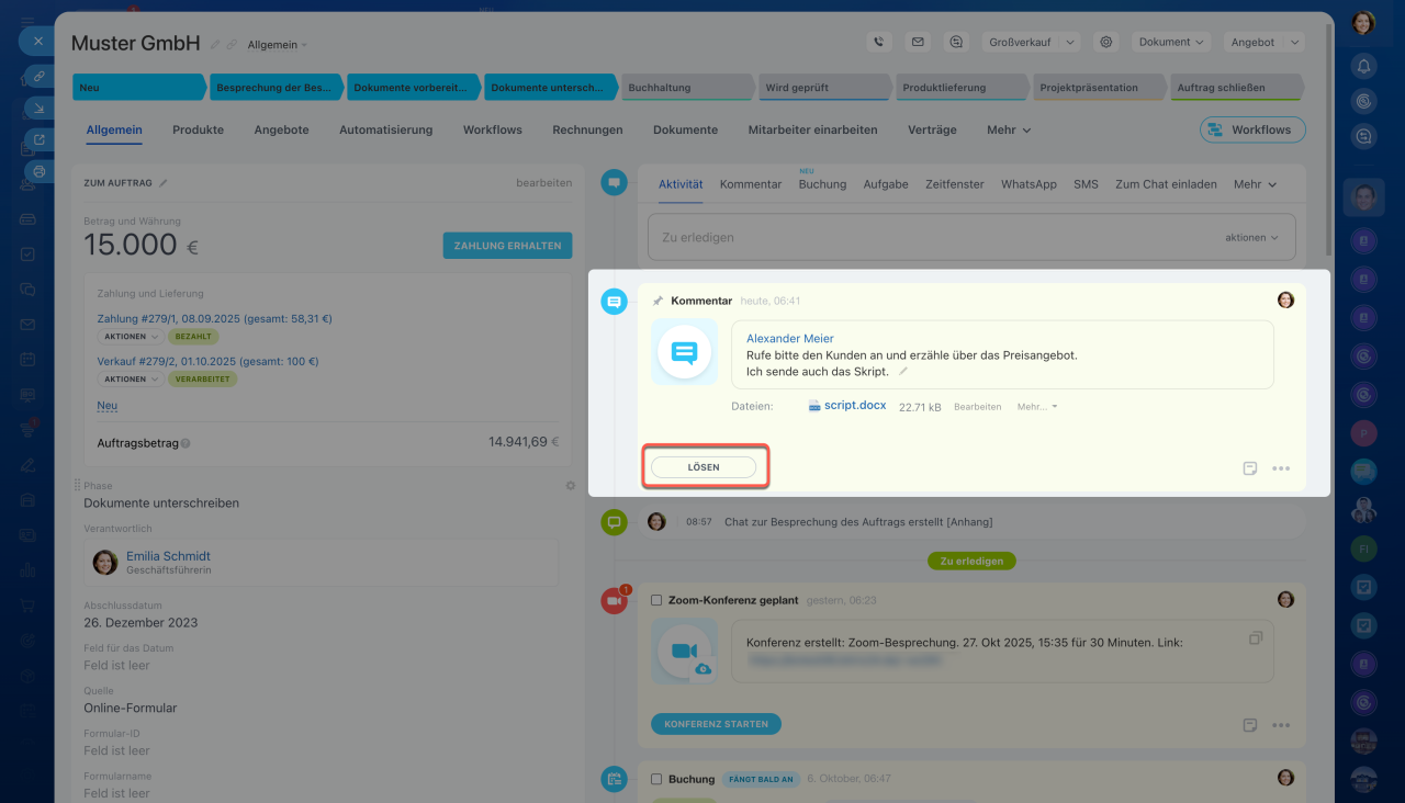 - In der Timeline werden Workflow-Ereignisse angezeigt. Sie können Workflow-Aufgaben und Kommentare direkt im Formular des CRM-Elements einsehen. Die Status informieren Sie über die aktuellen Workflow-Phasen.