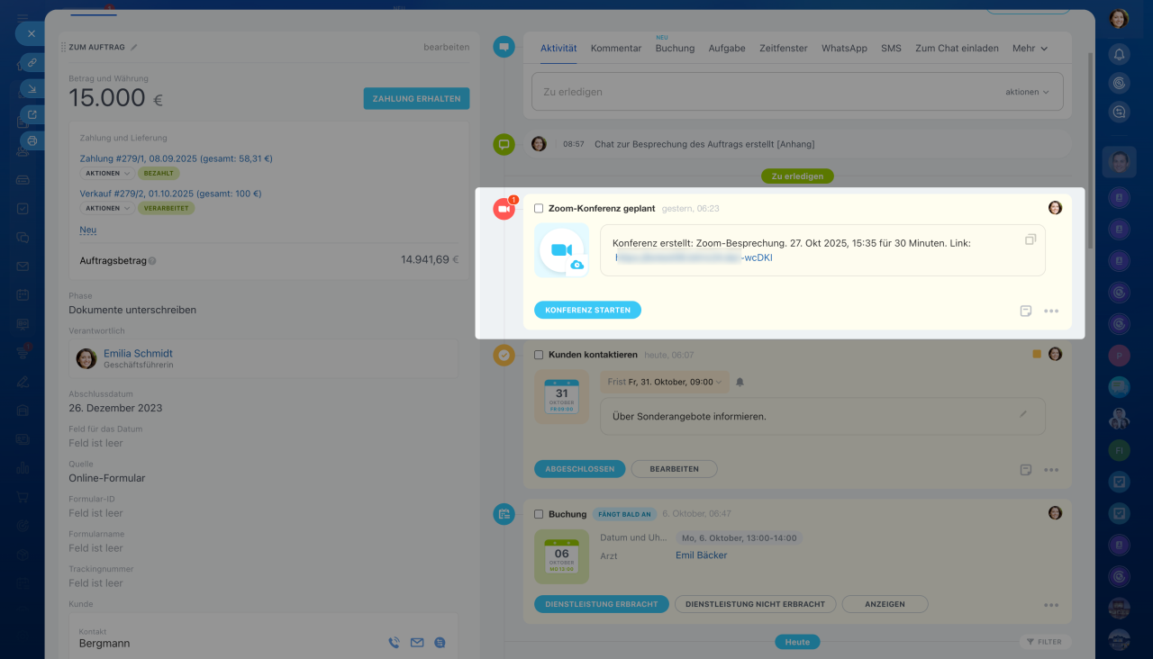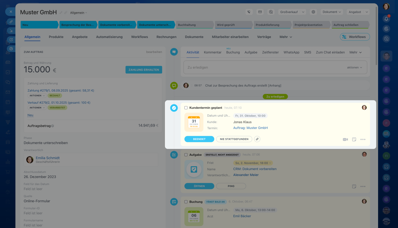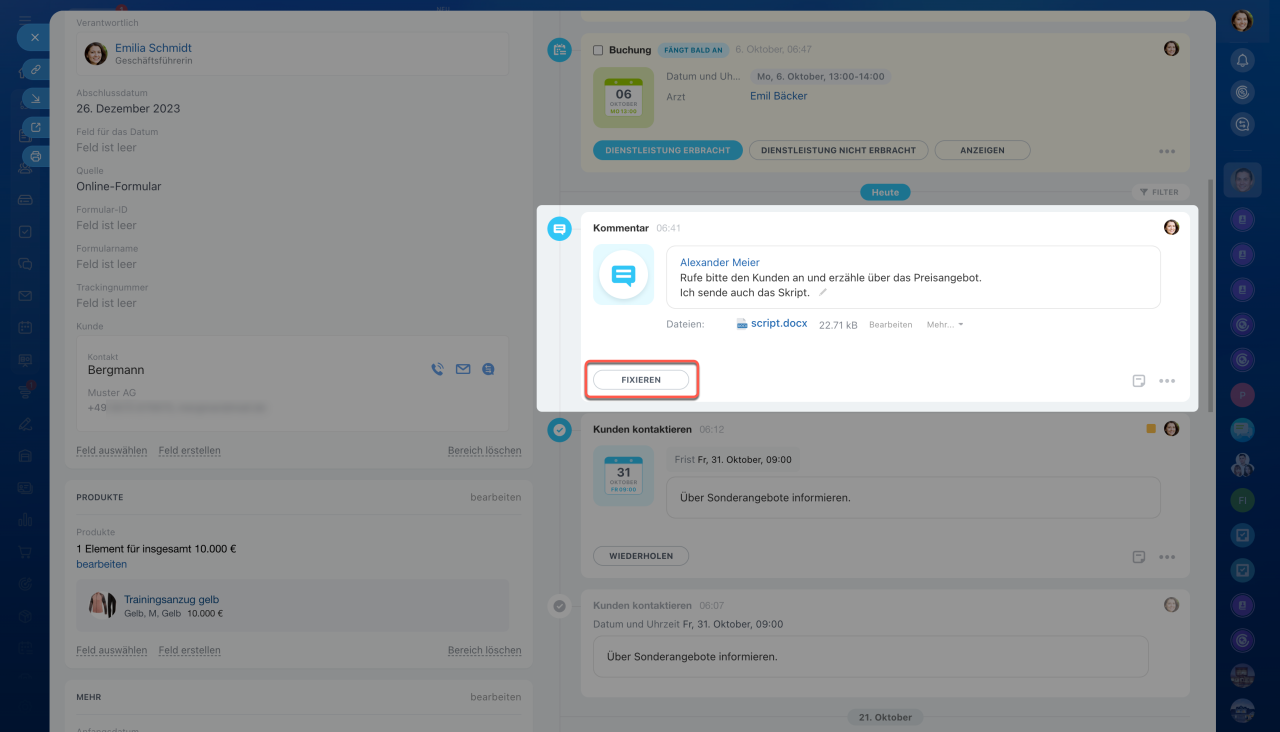 - Die Timeline befindet sich im rechten Bereich des CRM-Formulars. Hier können Sie Kundenaktivitäten planen, Kommentare für Kollegen hinterlassen, Phasenänderungen verfolgen und mehr. Wenn nötig, können die Aktivitäten aus einem CRM-Element in ein anderes verschoben werden.