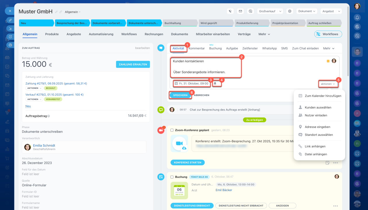 - Die Aktivität im CRM bietet ein Formular für alle kundenbezogenen Aufgaben. Damit können Sie beispielsweise Anrufe, Termine oder die Vorbereitung von Dokumenten planen.