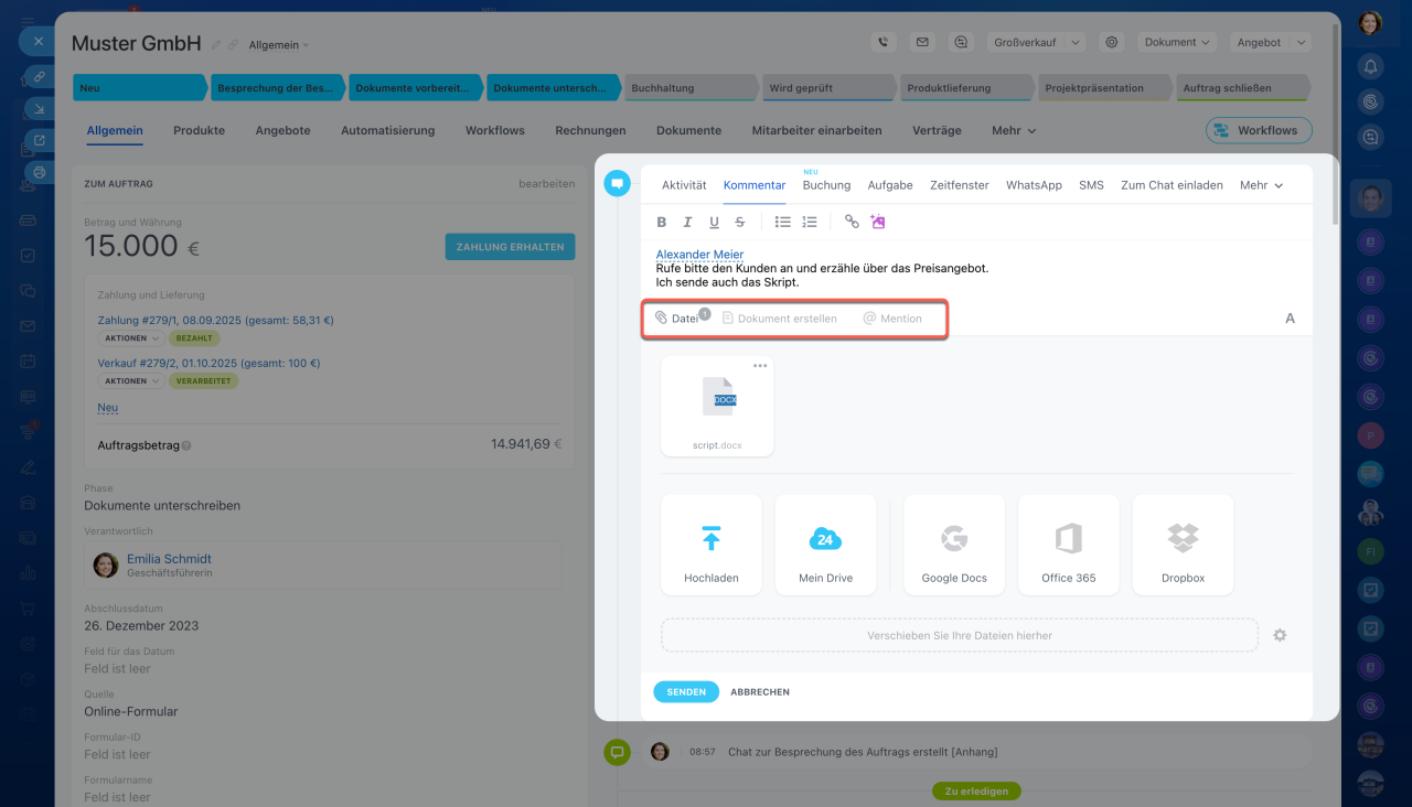 Kollegen erwähnen. Klicken Sie auf Mention und schreiben Sie eine Nachricht an den Mitarbeiter. Der Kollege erhält eine Benachrichtigung und wird den Kommentar nicht übersehen.