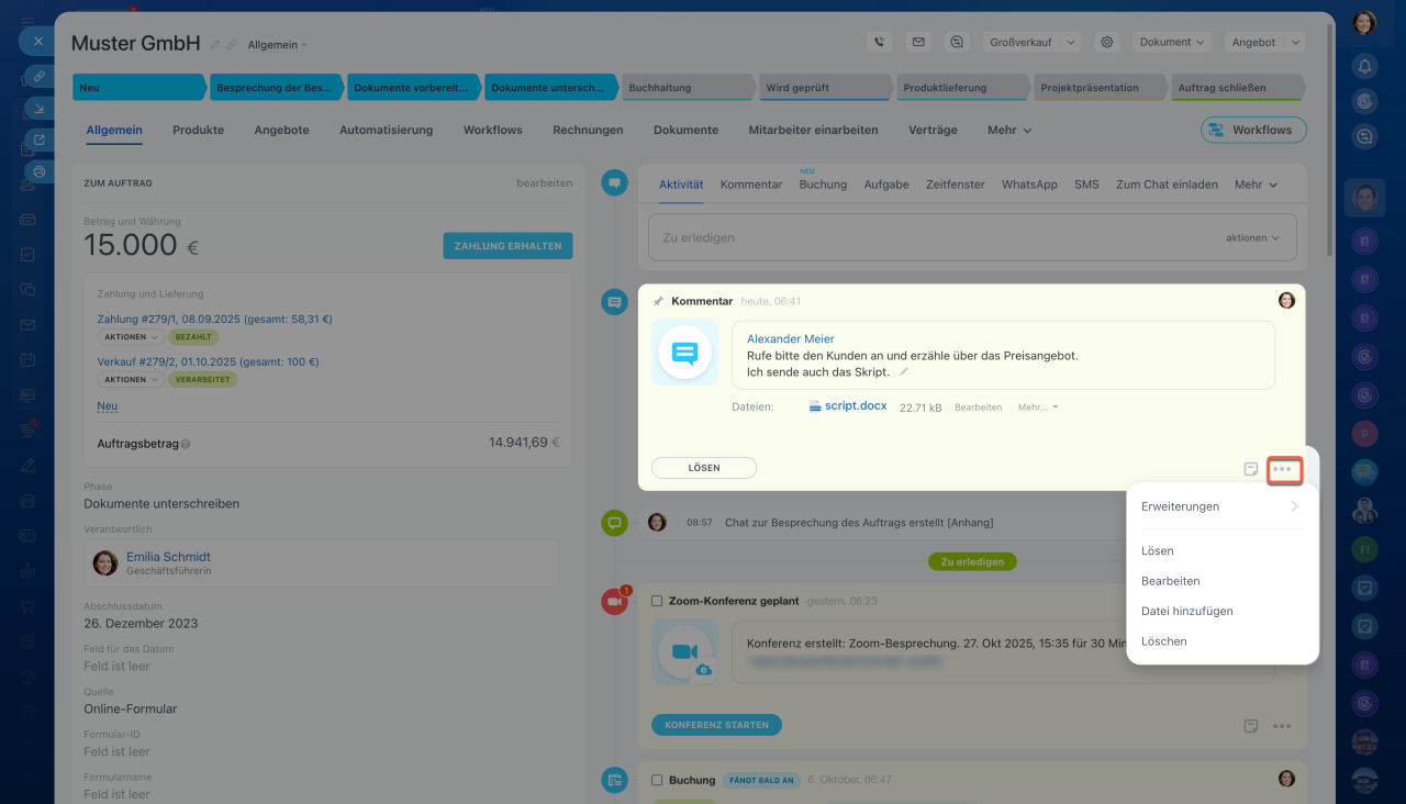 Um Ihrem Kollegen wichtige Details zum Kunden oder Auftrag mitzuteilen, verfassen Sie einen Kommentar.