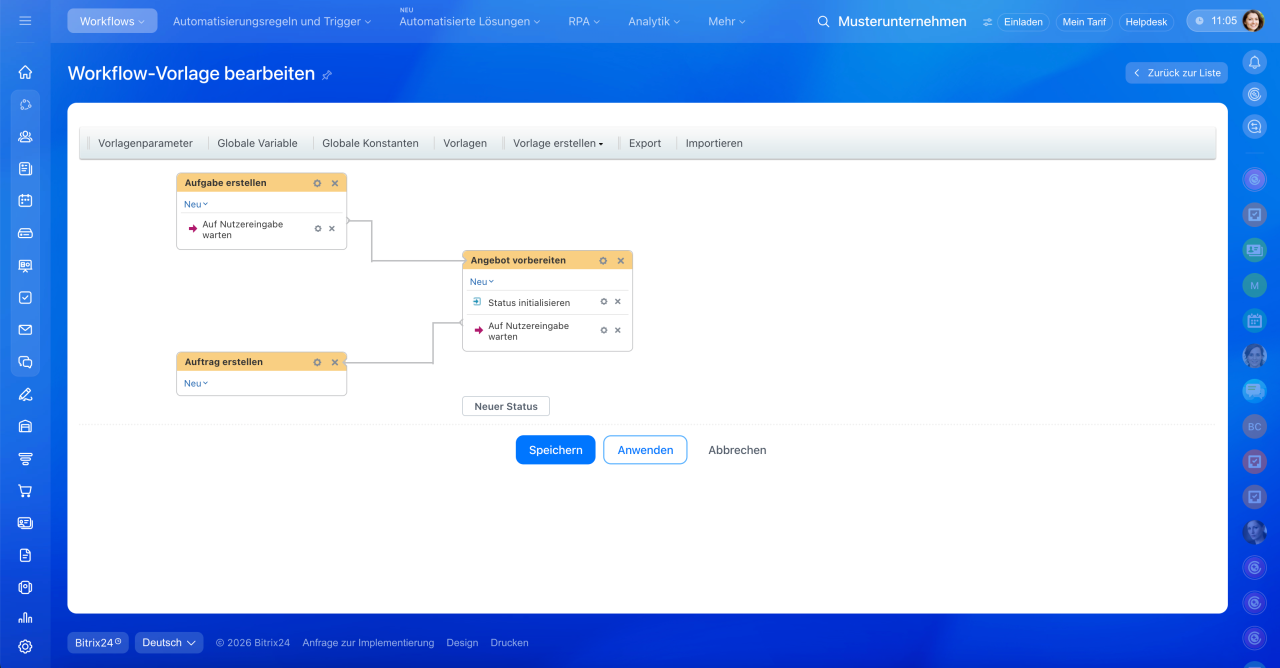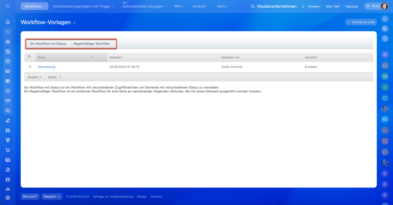 - In Bitrix24 stehen zwei Workflow-Typen zur Verfügung: regelmäßige Workflows und Workflows mit Status.