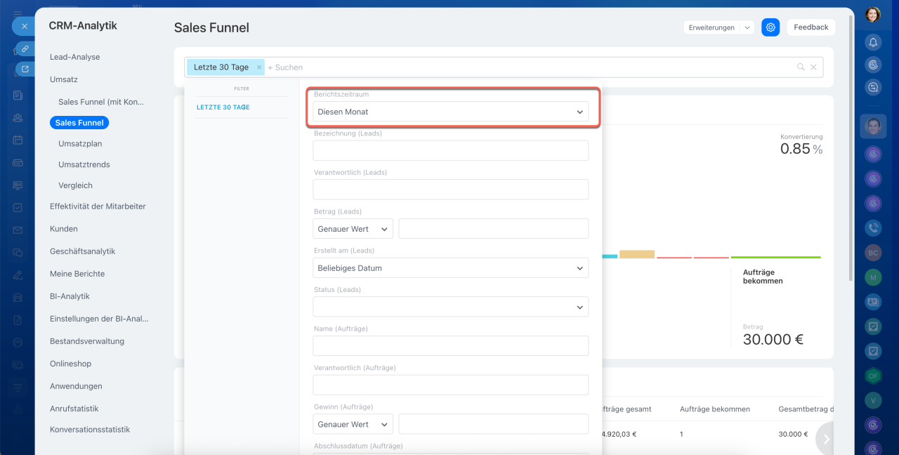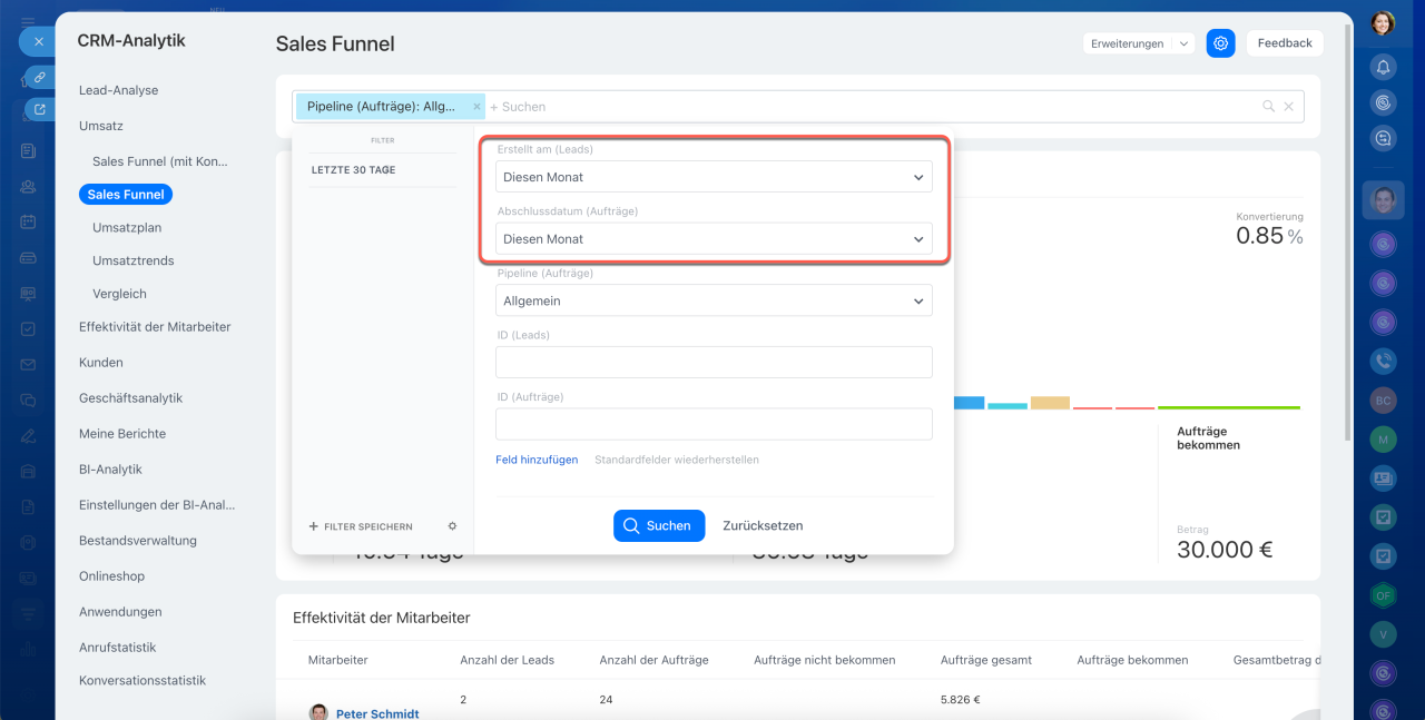 Wir zeigen, wie sich die Daten in Analyseberichten je nach angewendetem Filter unterscheiden, am Beispiel des Berichts Sales Funnel aus der CRM-Analytik.