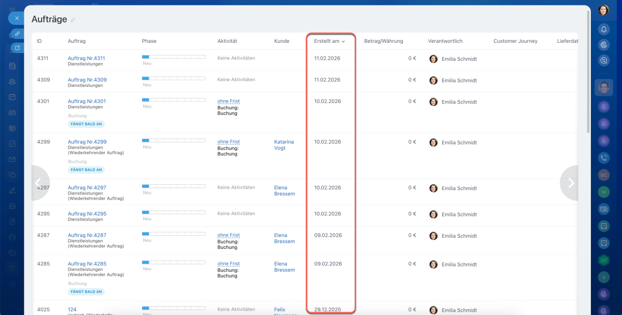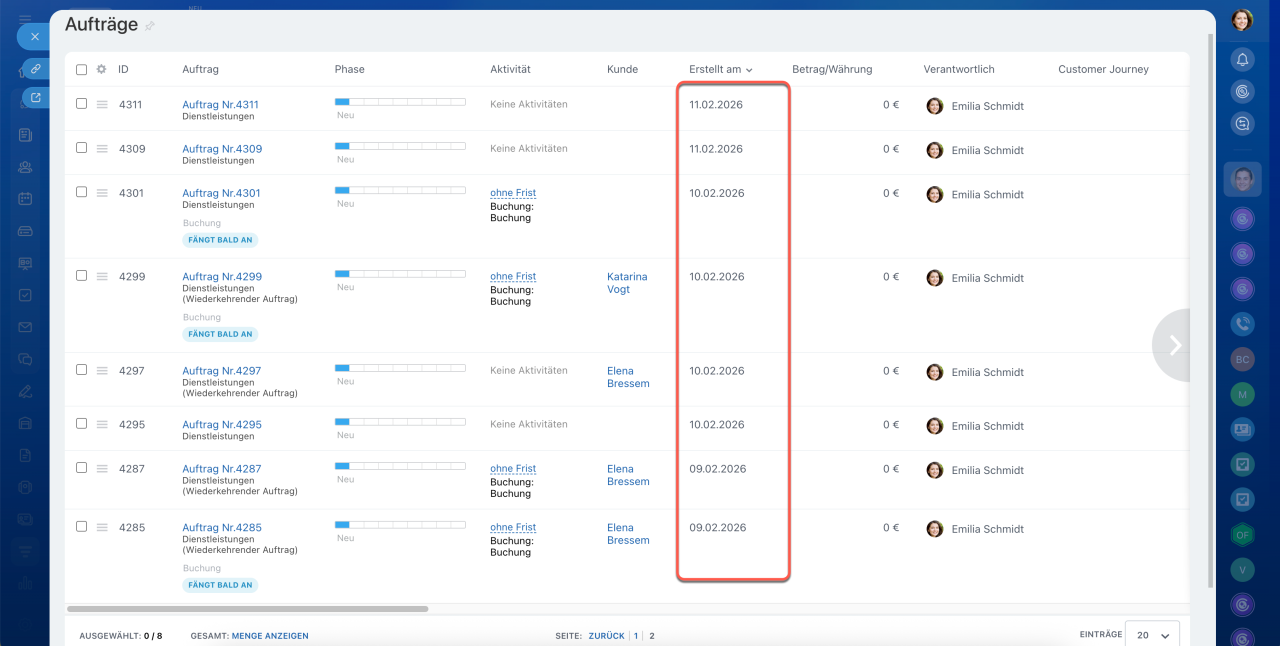 Wenn wir im Filter Berichtszeitraum den aktuellen Monat auswählen, werden uns 86 Aufträge angezeigt. Bei genauerer Überprüfung stellen wir fest, dass nur 8 davon tatsächlich in diesem Monat erstellt wurden.