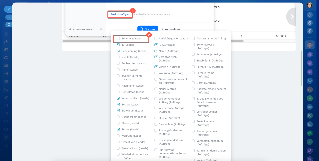 Um sich ausschließlich auf Aufträge zu konzentrieren, die in diesem Monat erstellt und abgeschlossen wurden, entfernen Sie das Feld Berichtszeitraum. Klicken Sie dazu auf Feld hinzufügen und deaktivieren Sie es.
