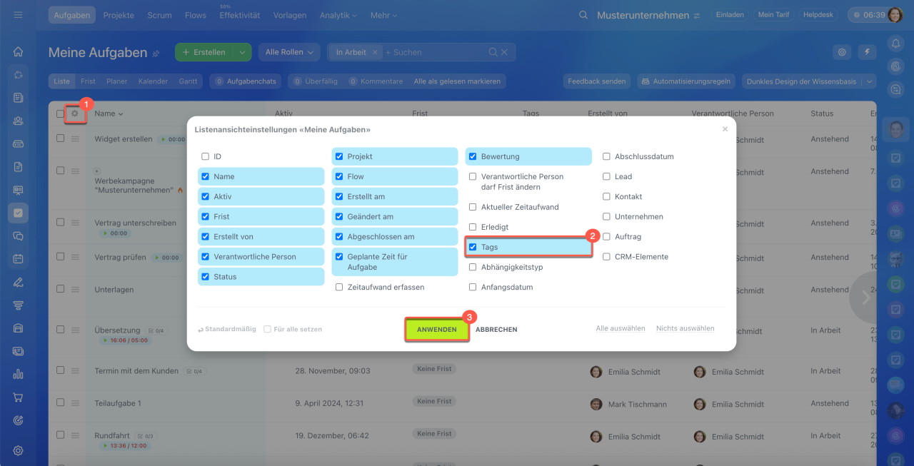 Zu den Spalten werden Felder, die in der Aufgabenliste angezeigt sind. Um die anderen Parameter hinzuzufügen, richten Sie die Liste ein: