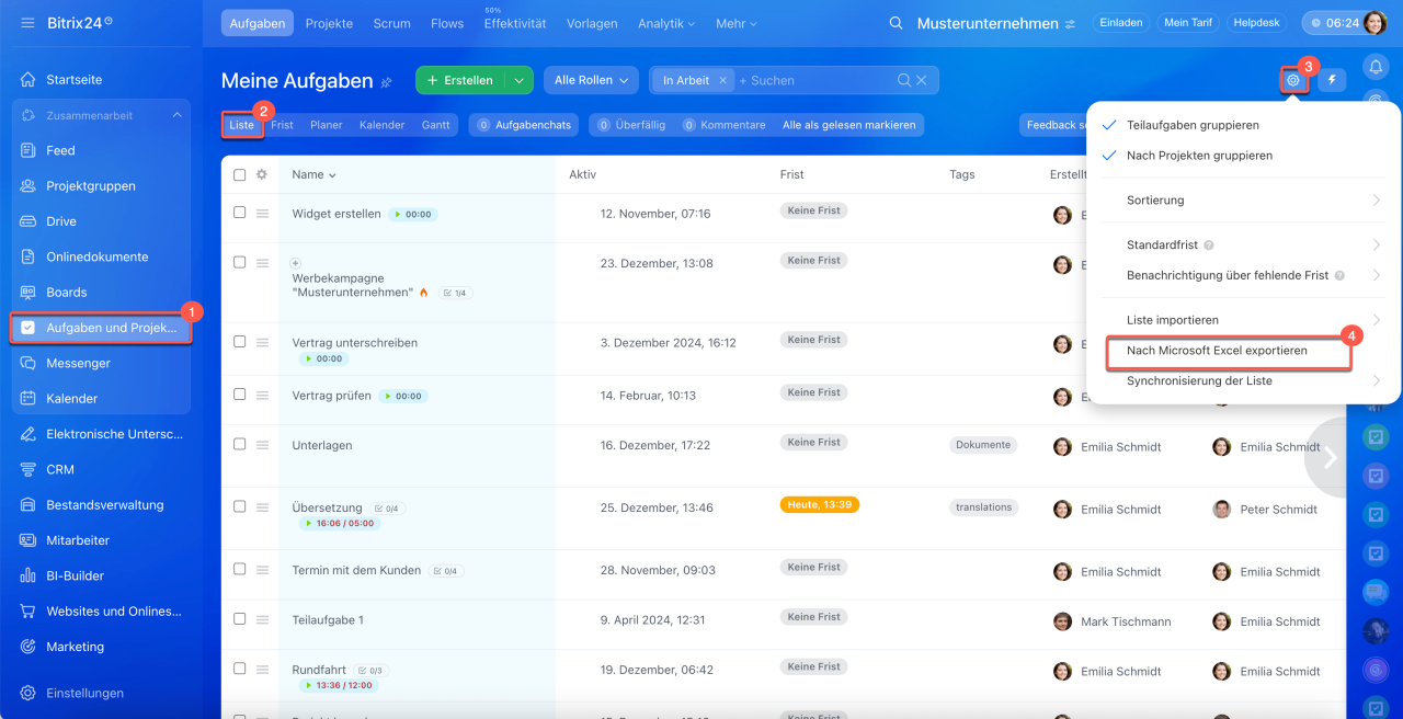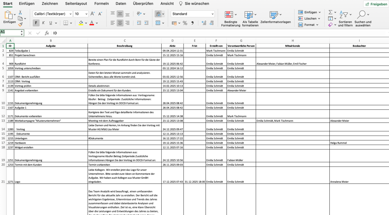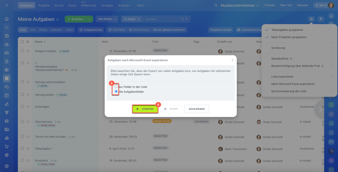 Um die Aufgaben nach Microsoft Excel zu exportieren, führen Sie folgende Schritte aus: