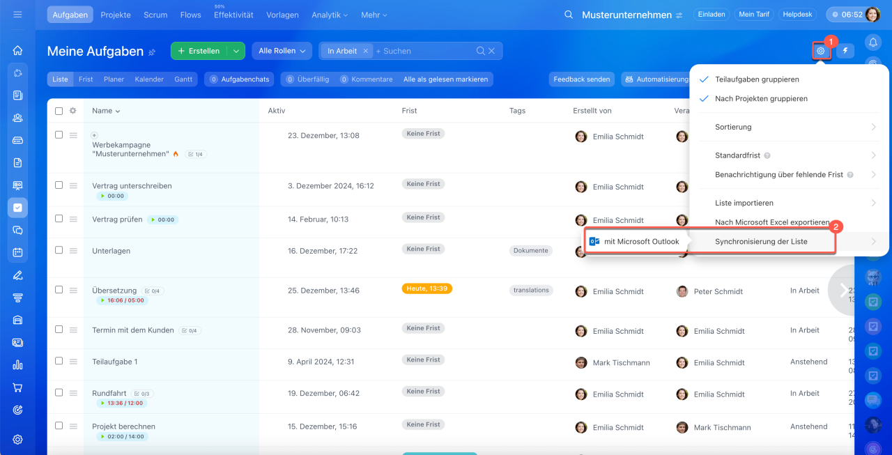 - Um Ihre die Aufgaben in MS Outlook weiter bearbeiten zu können, klicken Sie auf Einstellungen (⚙️), wählen Sie die Option Synchronisierung der Liste > Mit Microsoft Outlook.