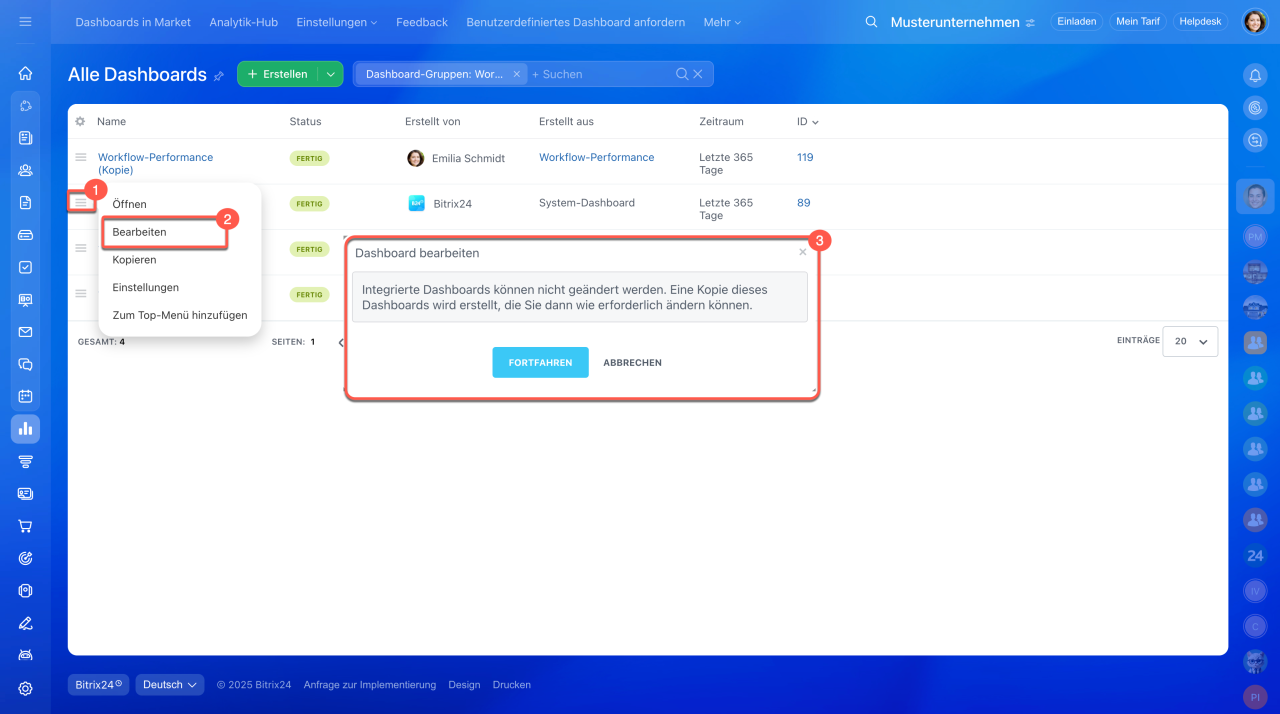 System-Dashboards können nicht direkt bearbeitet werden, aber Sie können sie kopieren und dann anpassen. Wählen Sie das gewünschte Dashboard aus der Liste und klicken Sie auf Menü (≡) > Bearbeiten > Fortfahren. Bitrix24 erstellt eine Kopie, die Sie wie gewünscht konfigurieren können.
