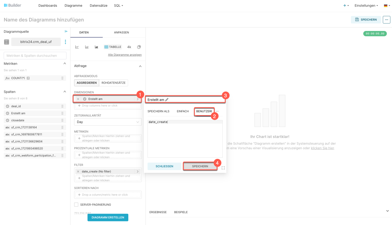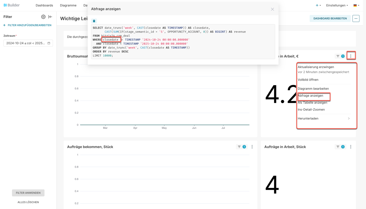 Wenn der Filter nicht funktioniert. Überprüfen Sie, ob der Datensatz eine Spalte vom Typ „Datum/Zeit“ enthält – z. B. DATECREATE oder CLOSEDATE. Ohne diese Spalte kann der BI-Builder die Daten nicht filtern. Öffnen Sie im Bearbeitungsmodus die Diagrammeinstellungen und klicken Sie auf Abfrage anzeigen. Wenn die Spalte fehlt, bearbeiten Sie die SQL-Abfrage und fügen Sie diese hinzu.