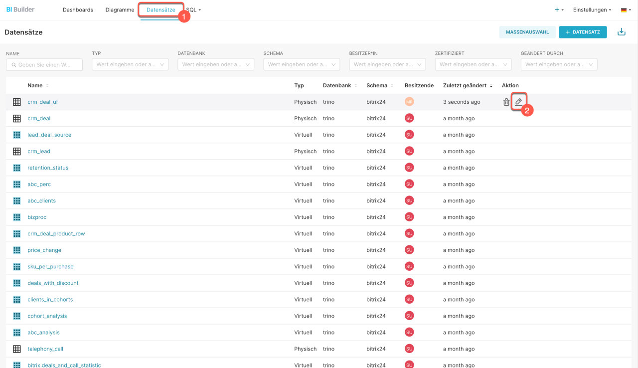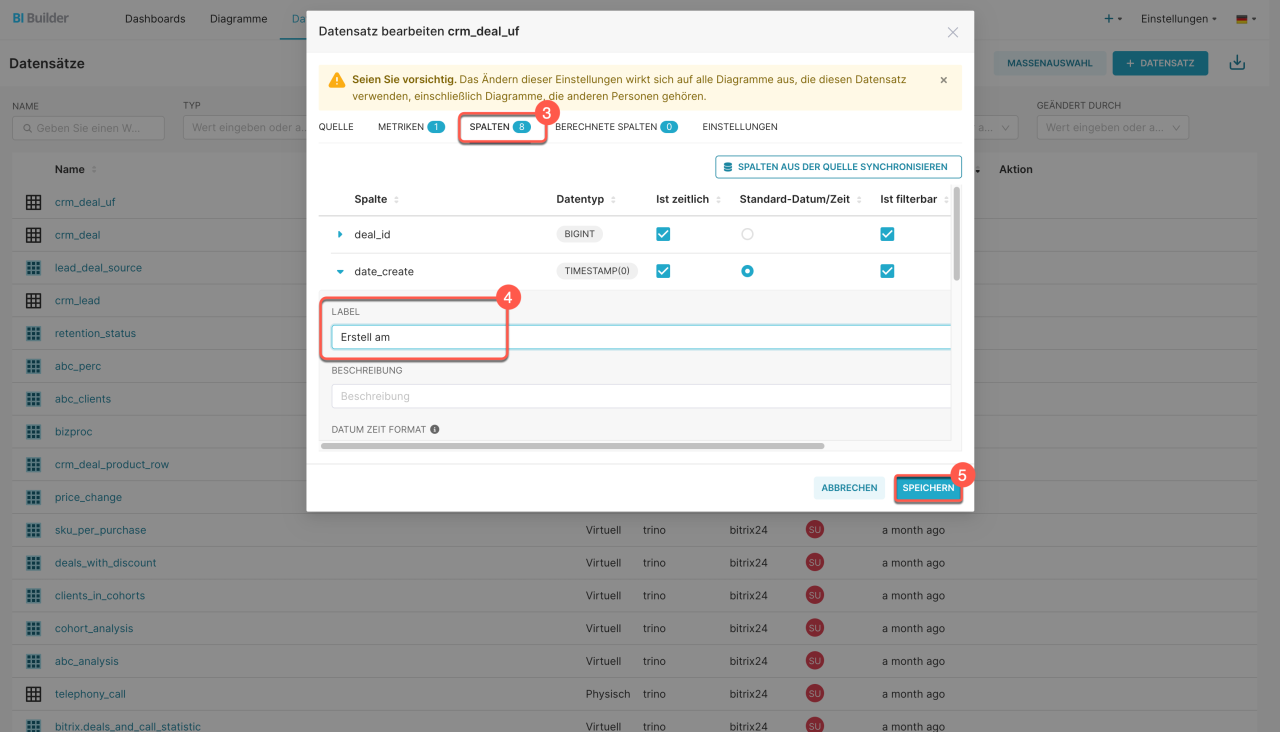 Feldnamen in den Datensatz- oder Diagrammeinstellungen festlegen. Feldnamen lassen sich direkt auf Datensatzebene anpassen. Der BI-Designer übernimmt diese Änderungen für alle Diagramme, während die ursprünglichen Systemnamen in der Datenbank unverändert bleiben. Öffnen Sie dazu den Bereich Datensätze, wählen Sie den gewünschten virtuellen Datensatz aus und klicken Sie auf Bearbeiten. Benennen Sie im Tab Spalten die entsprechenden Spalten um und speichern Sie anschließend die Änderungen.